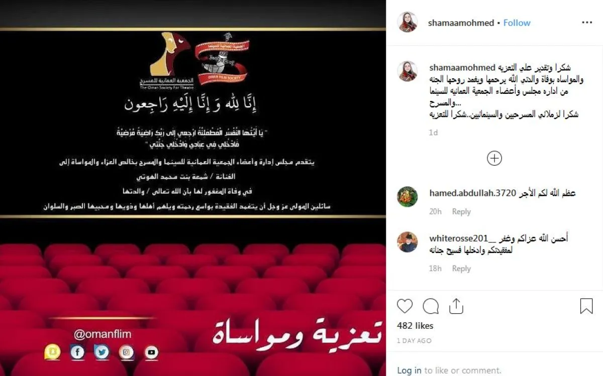 وعلقت على بطاقة تعزية أُرسلت لها من قِبَل إدارة مجلس الجمعية العمانية للسينما والمسرح وأعضائه، وقالت: (شكر وتقدير على التعزية والمواساة بوفاة والدتي الله يرحمها ويغمد روحها الجنة من إدارة مجلس وأعضاء الجمعية العمانية للسينما والمسرح .. شكرًا لزملائي المسرحيين والسينمائيين .. شكرًا للتعزية).