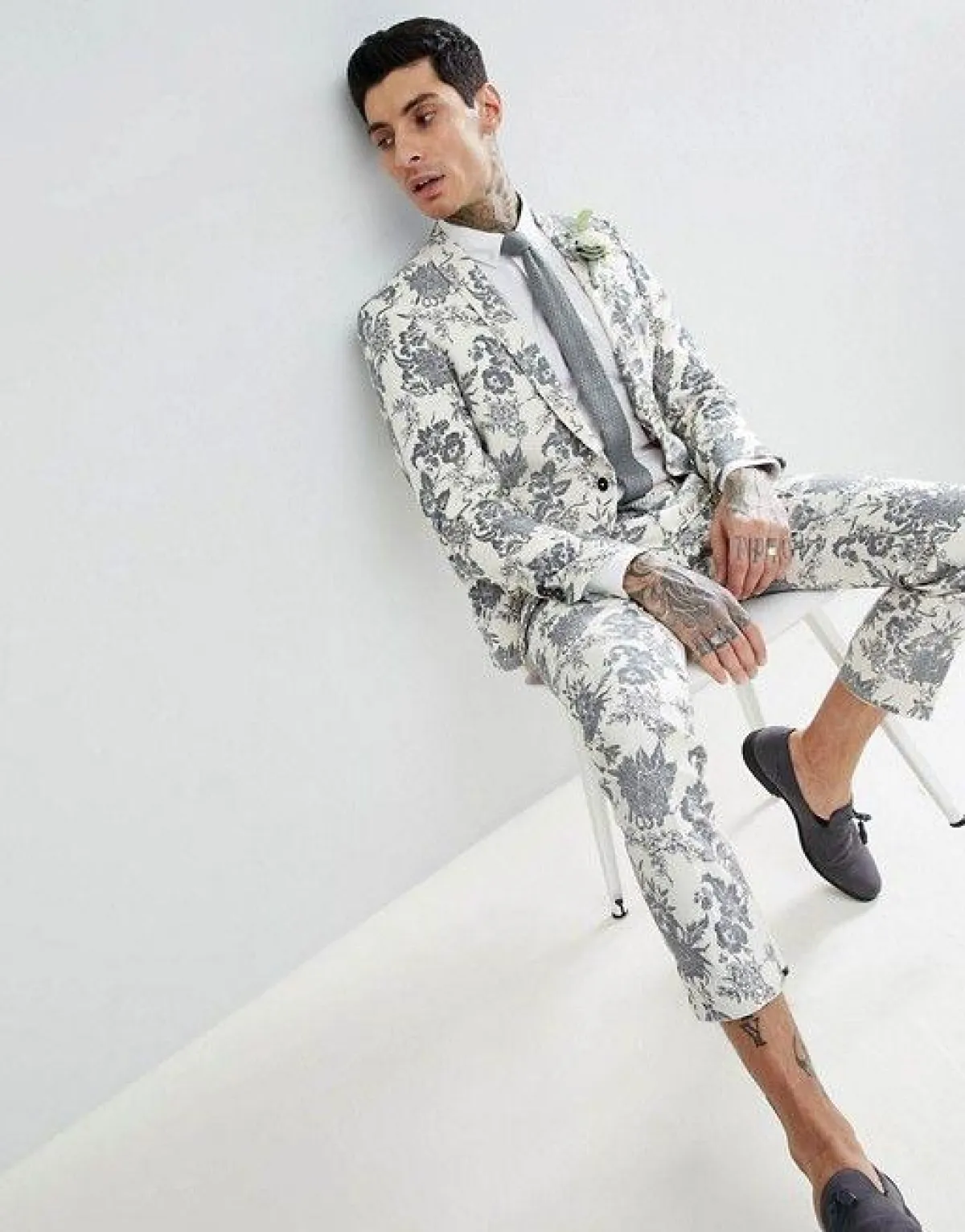 لا مانع من اقتناء الرجل لصيحة الأزياء المنقوشة، فيمكنك تنسيق بدلة من اللون الأبيض منقوشة بلون مختلف كالرمادي، مع ربطة عنق من اللون الرمادي وقميص أبيض، منتعلاً حذاءً كلاسيكيًّا رسميًّا من اللون نفسه .