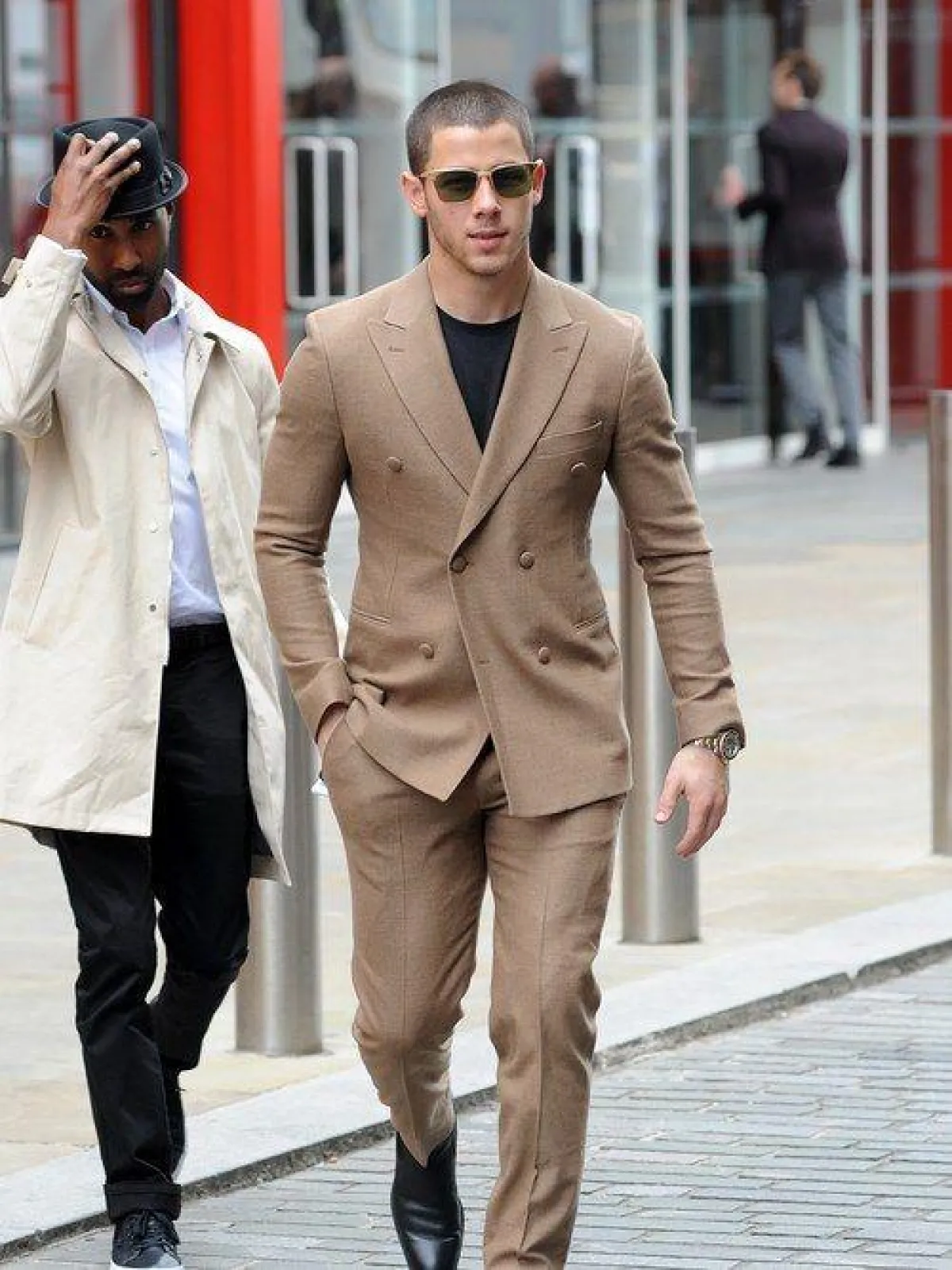 اذا كنت من الأشخاص الذين لا يجرؤون على اعتماد أزياء ملوّنة، فيمكنك كسر القاعدة باطلالة البدلة الرسمية بلون مختلف و صيفي . نسّق البدلة الرسمية من اللون الكاكي مع حذاء من اللون الأسود وبلوزة من اللون نفسه، كما فعل نيك جوناس.