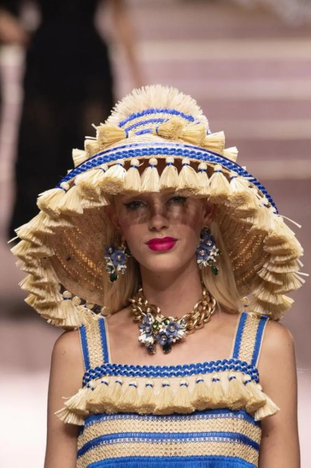 لاطلالة خارجة عن المألوف، نسّقي قبعة مزيّنة بـ الشراشيب كالتي رأيناها على ممشى عرض دار دولتشي أند غابانا مع فستان مخطط من اللون نفسه و حذاء برباط .
