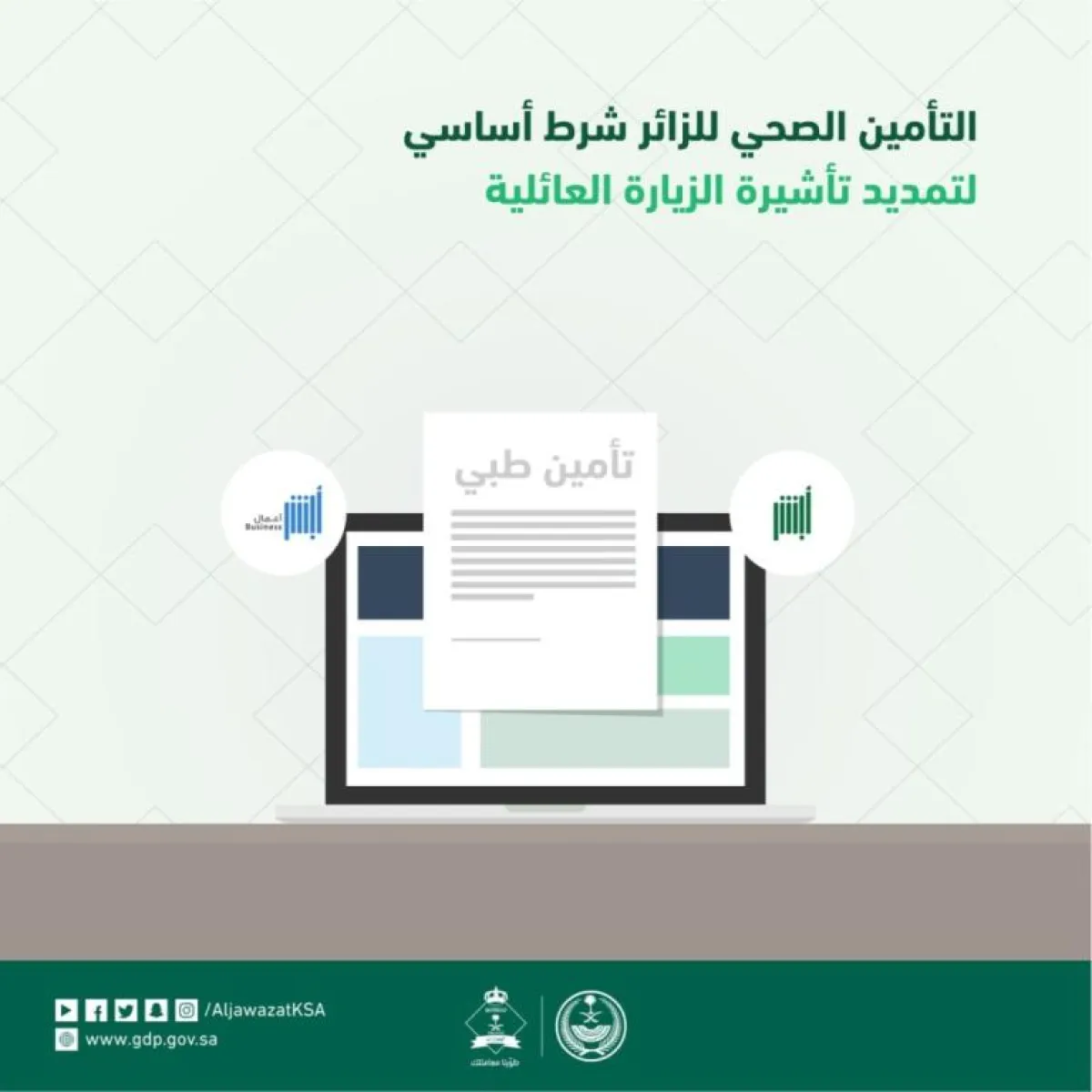 أكّدت المديرية العامة للجوازات، مجدداً، عبر حسابها الرسمي على موقع التواصل الاجتماعي "تويتر"، على أن التأمين الصحي شرط أساس لتمديد تأشيرة الزيارة العائلية.