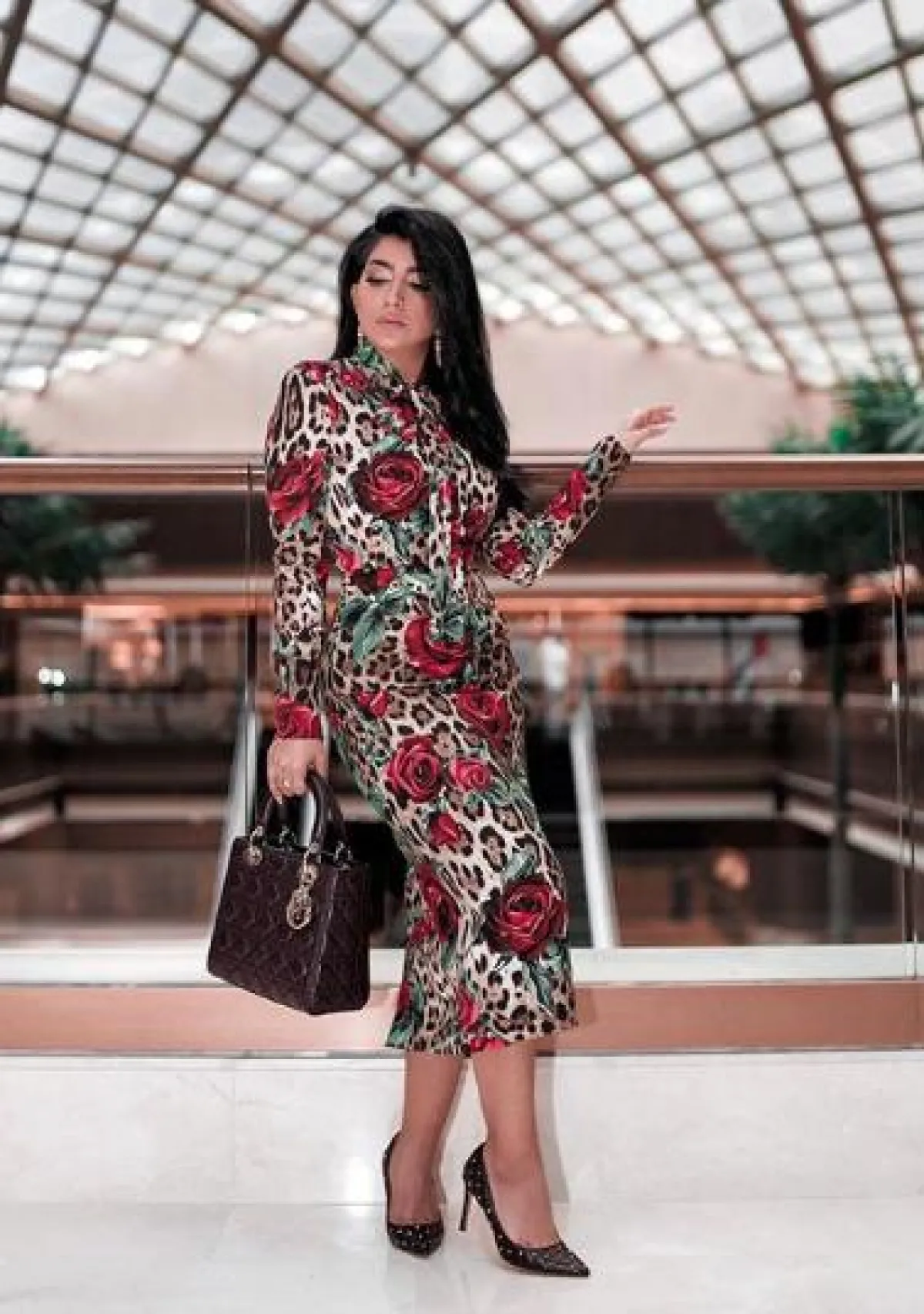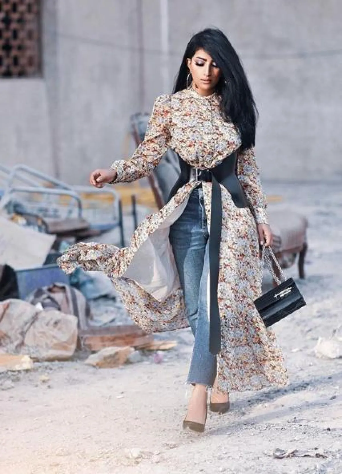 تنسيق مميز آخر شاهدنا به بثينة الرئيسي، وهذه المرة اعتمدت بنطلون جينز باللون الأزرق بقصة كلاسيكية، نسقت معه قميصًا طويلًا معرقًا برسومات الورود، وزينت خصرها بحزام كورسيه من الجلد باللون الأسود من “الكسندر مكوين” Alexander McQueen وأكملت اللوك بحذاء بكعب عالٍ.