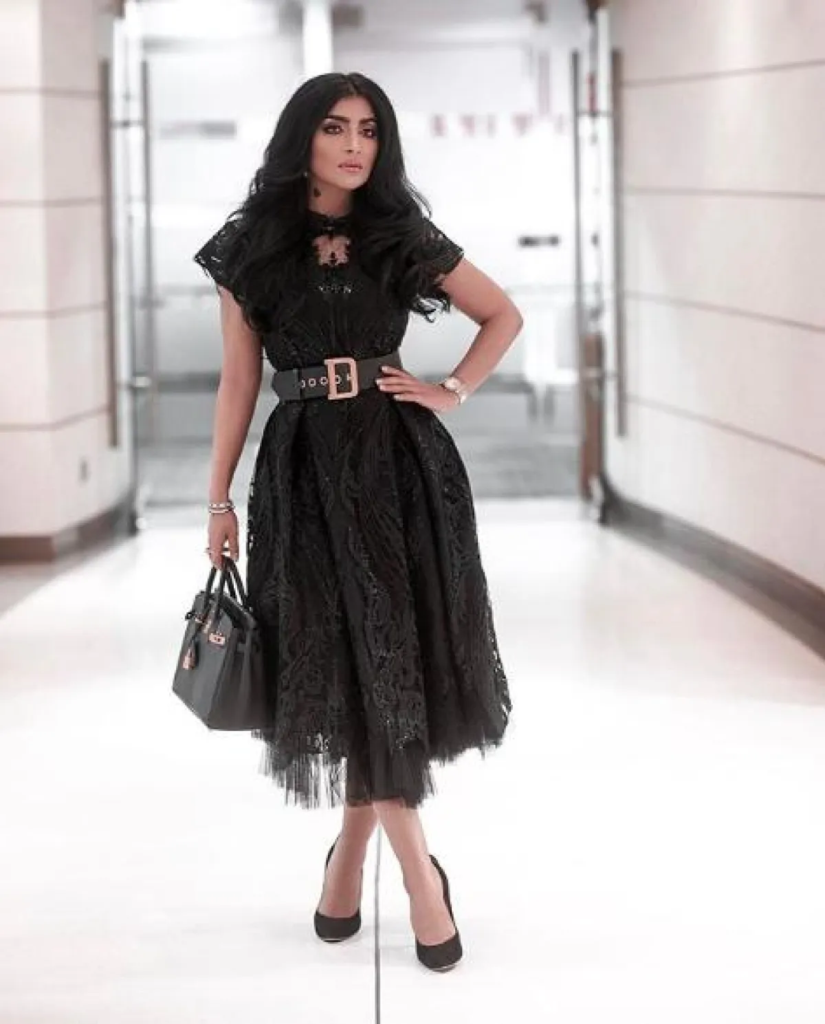 اطلالة رائعة اعتمدتها بثينة الرئيسي مؤخرًا، جمعت بين الأنوثة والعصرية حيث إنها اختارت فستان ميدي من قماش التول والدانتيل الأسود، وزينت خصره بحزام عريض من “ديور” Dior، وأكملت اللوك بشنطة يد من الجلد من “هرمس” Hermes وحذاء بكعب عالٍ بتصميم كلاسيكي من “غوتشي” Gucci.