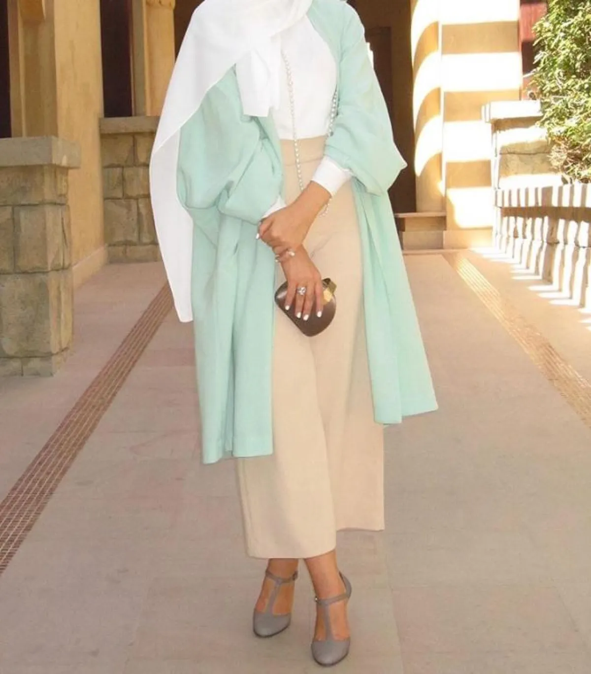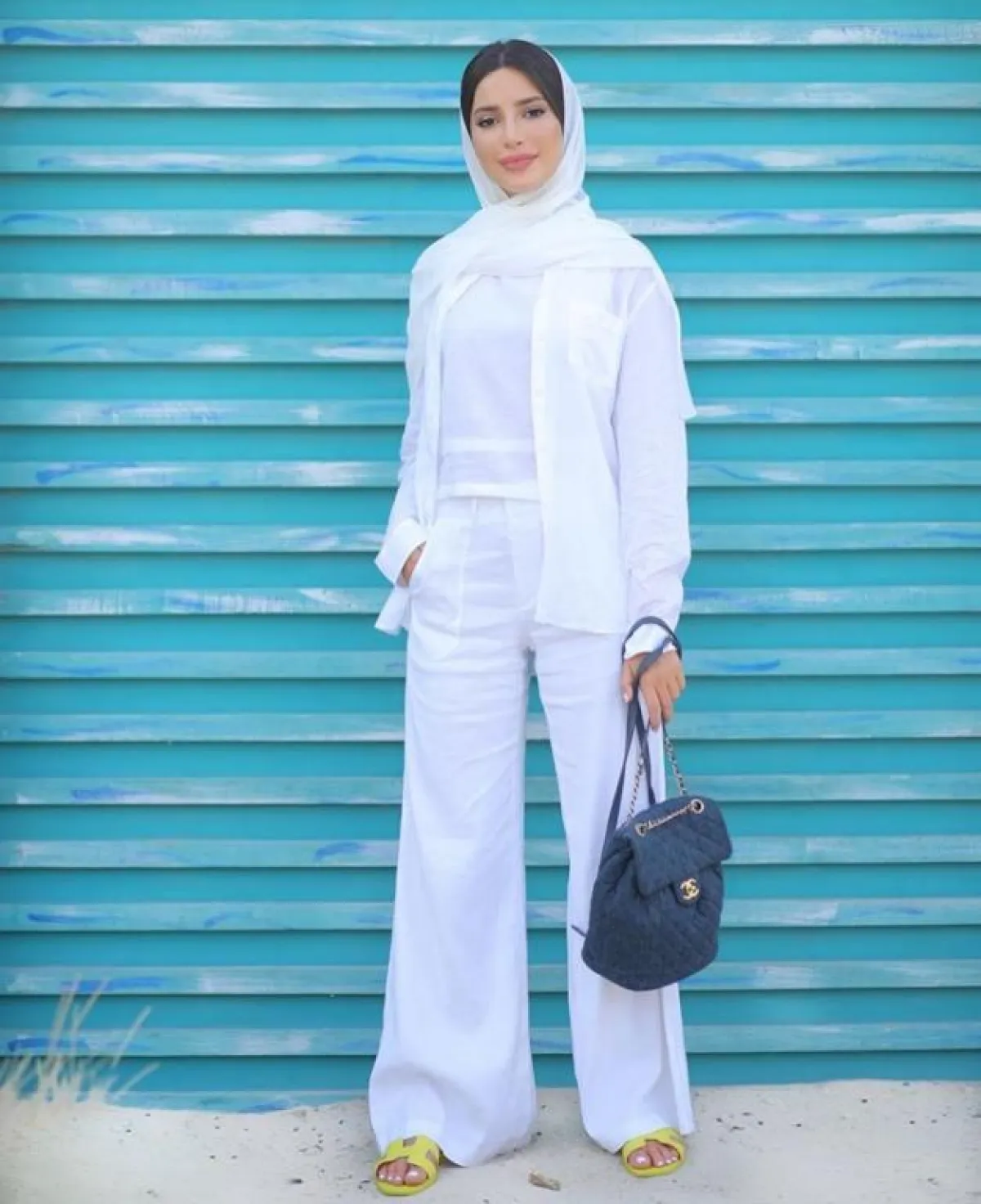 من الممكن أن تعتمدي على البناطيل البيضاء الشارلستون الواسعة، وتنسقيها بطريقة مخملية، مثلما فعلت فاطمة حسام، باعتماد التوب والجاكيت الخفيف الصيفي باللون الأبيض، مناسبة لمشاويركِ مع الصديقات، أو حتى بعطلتكِ الصيفية، سوف تكونين جذابة بخاصة مع السليبر المفتوح باللون الأصفر الخردلي.