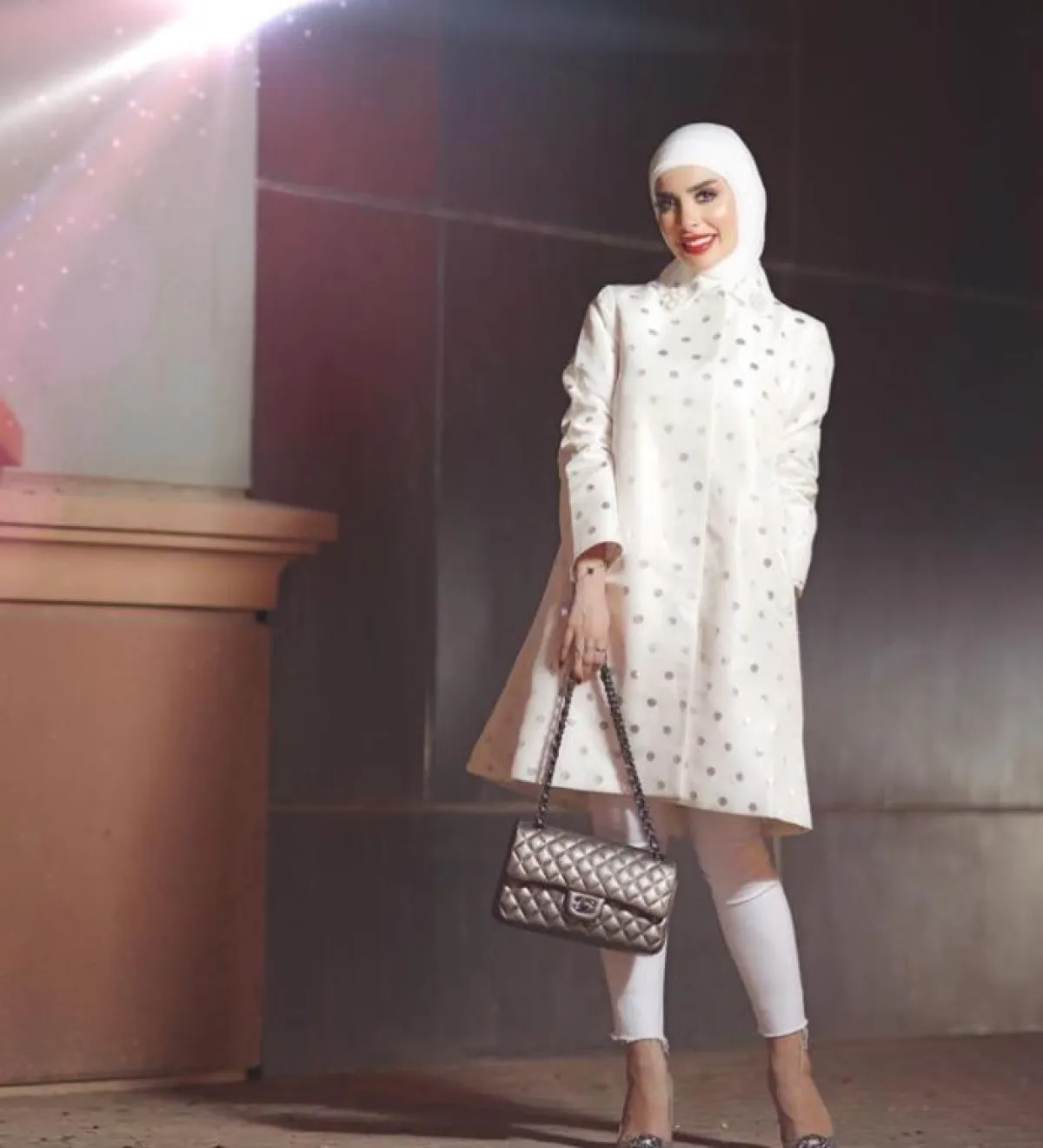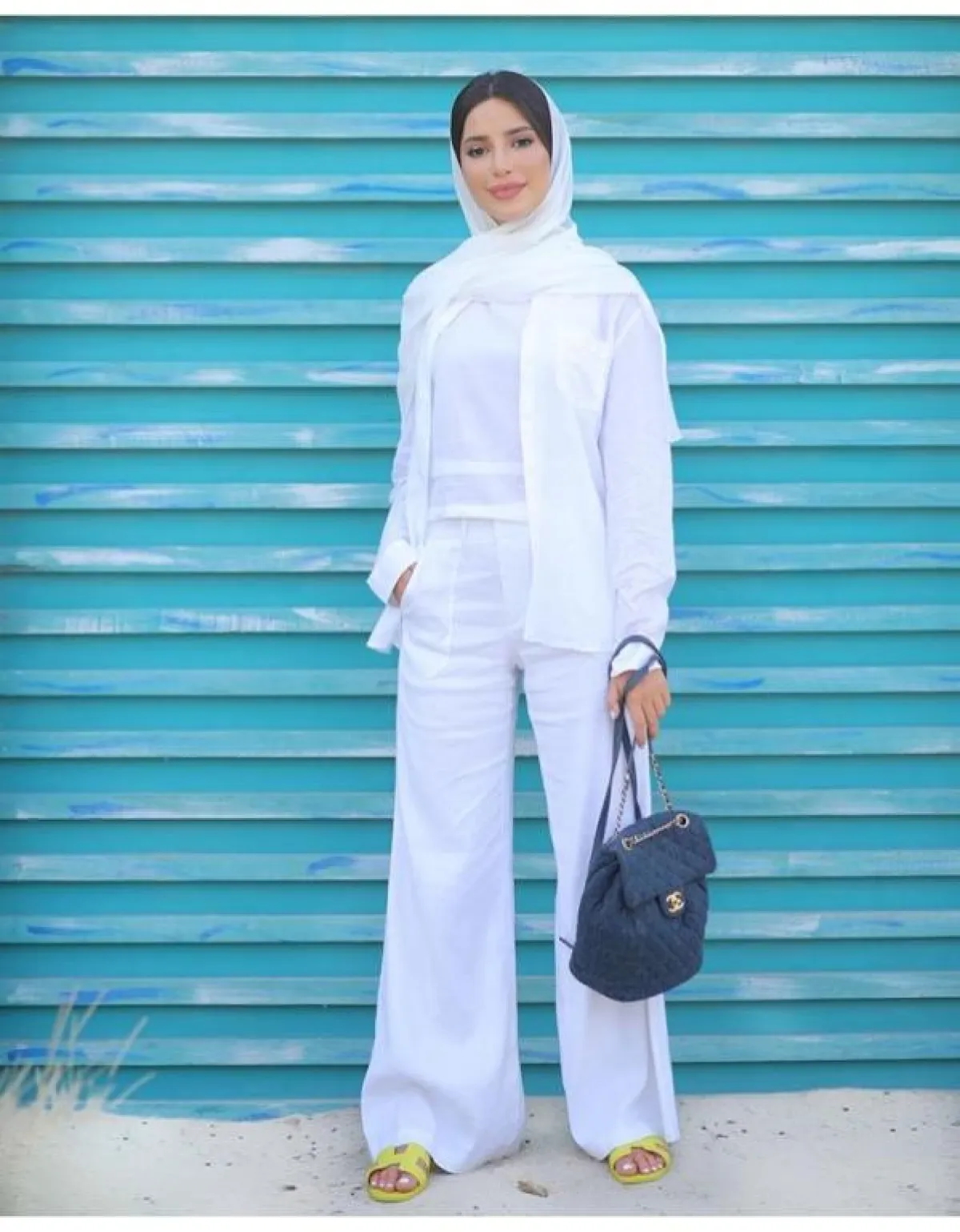 عادة ما تختار مدونات الخليج العبايات الصيفية مع ألوان حجاب سوداء، لكنّ اعتماد اللون الأبيض بدا أنيقًا وناعمًا باطلالة حنين الصيفي ، مع العبايه المكشكشة، نسقت معها حجابًا طويلًا أبيض، وحذاء نود، مناسبة لاطلالتكِ بالنهار، وقد تستمر معكِ للّيل أيضًا.