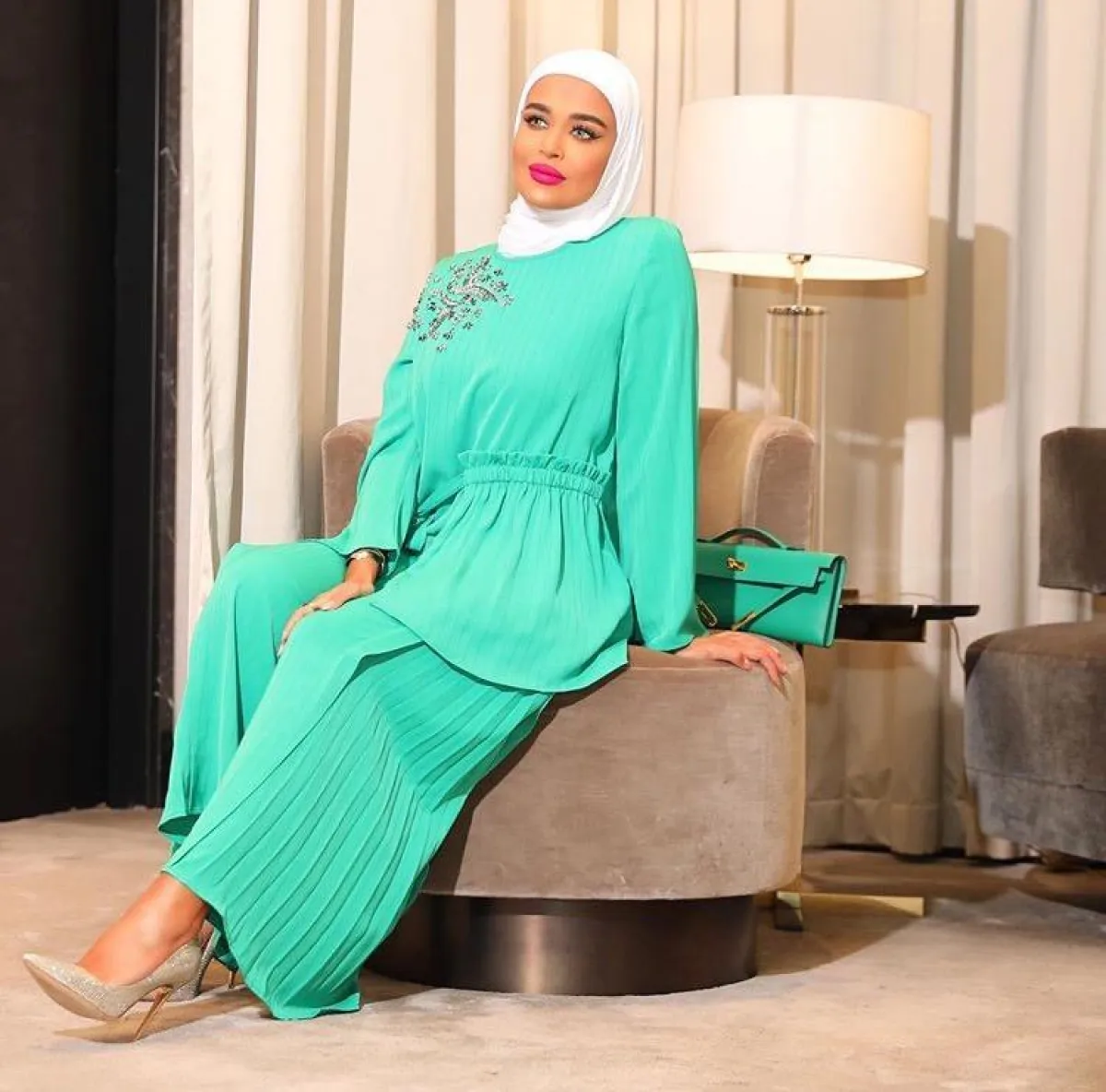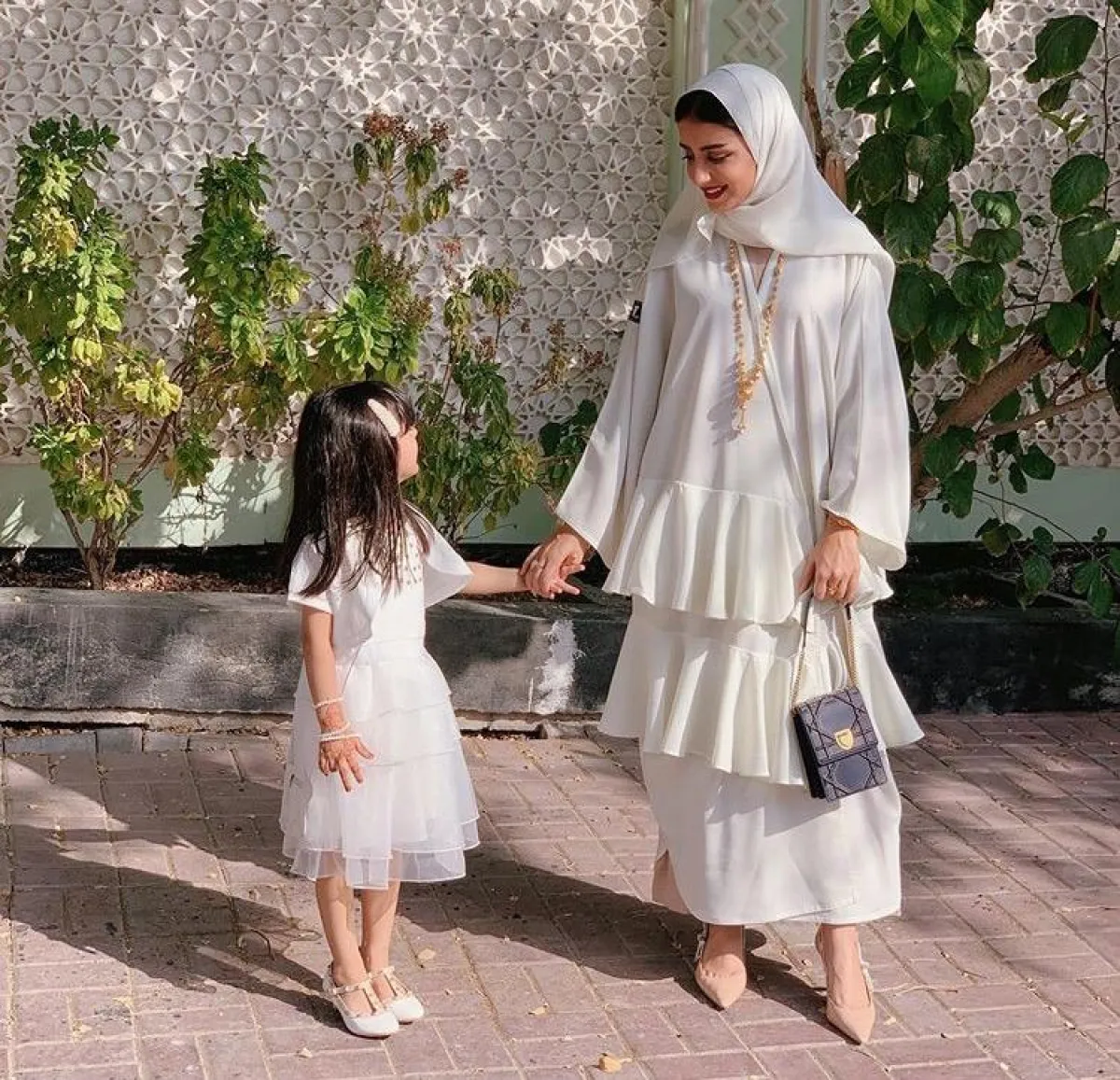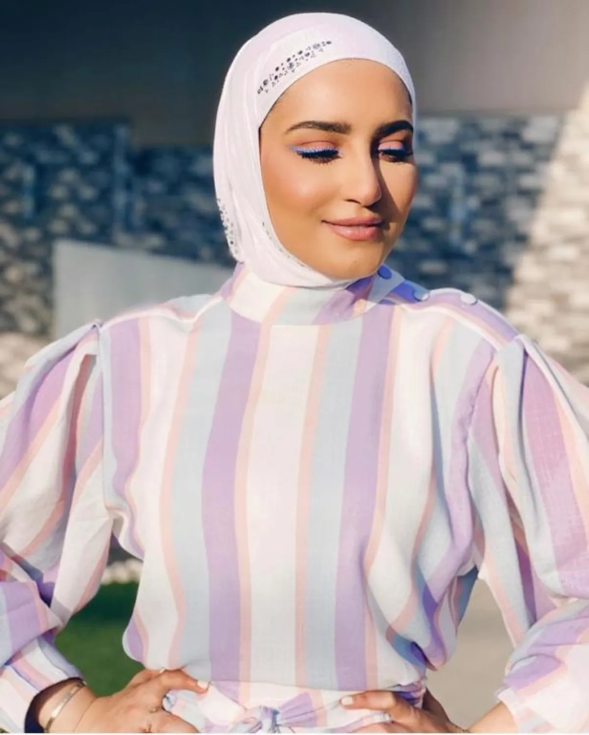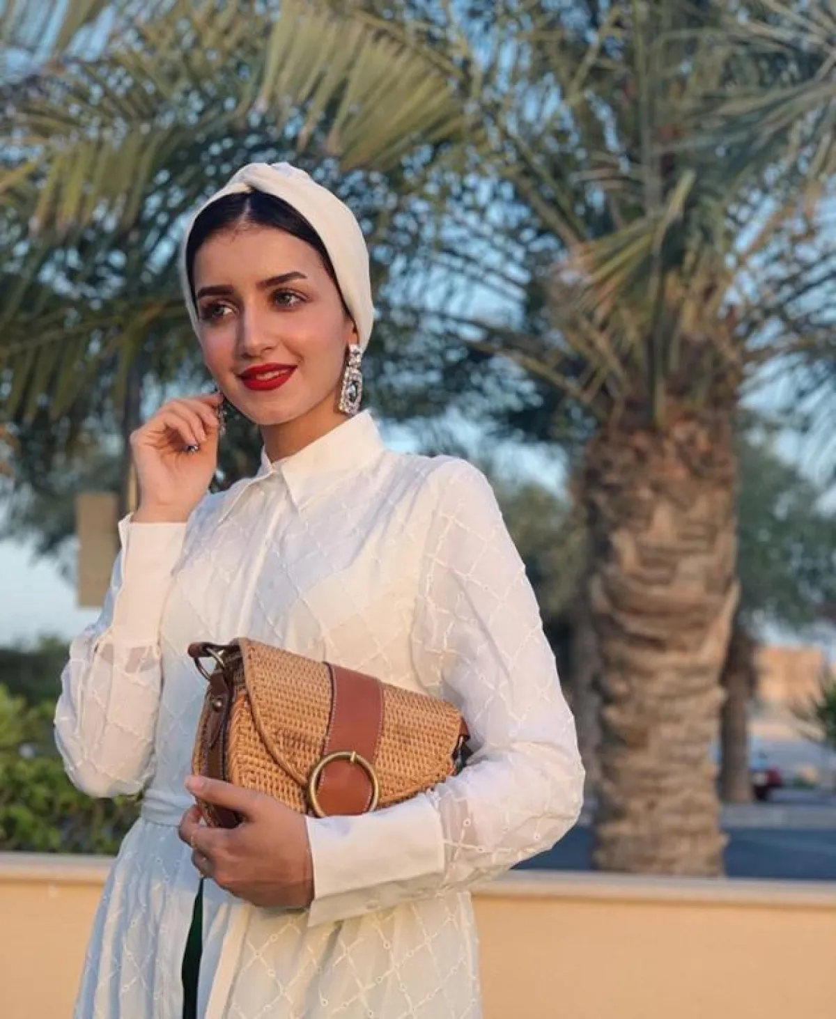 لفتنا آخر اطلالات مدونة الموضة الخليجية دلال الدوب للفساتين الصيفية الملونة، التي نسقت معها لفة الحجاب باللون الأبيض، فقط مع تطريزات لامعة وبسيطة على الحجاب، كما أنّ لونه لم يكن بدرجة الأبيض الصحيحة، كان مائلًا قليلًا لدرجة أرجوانية تتناسب أكثر مع ألوان الفستان.