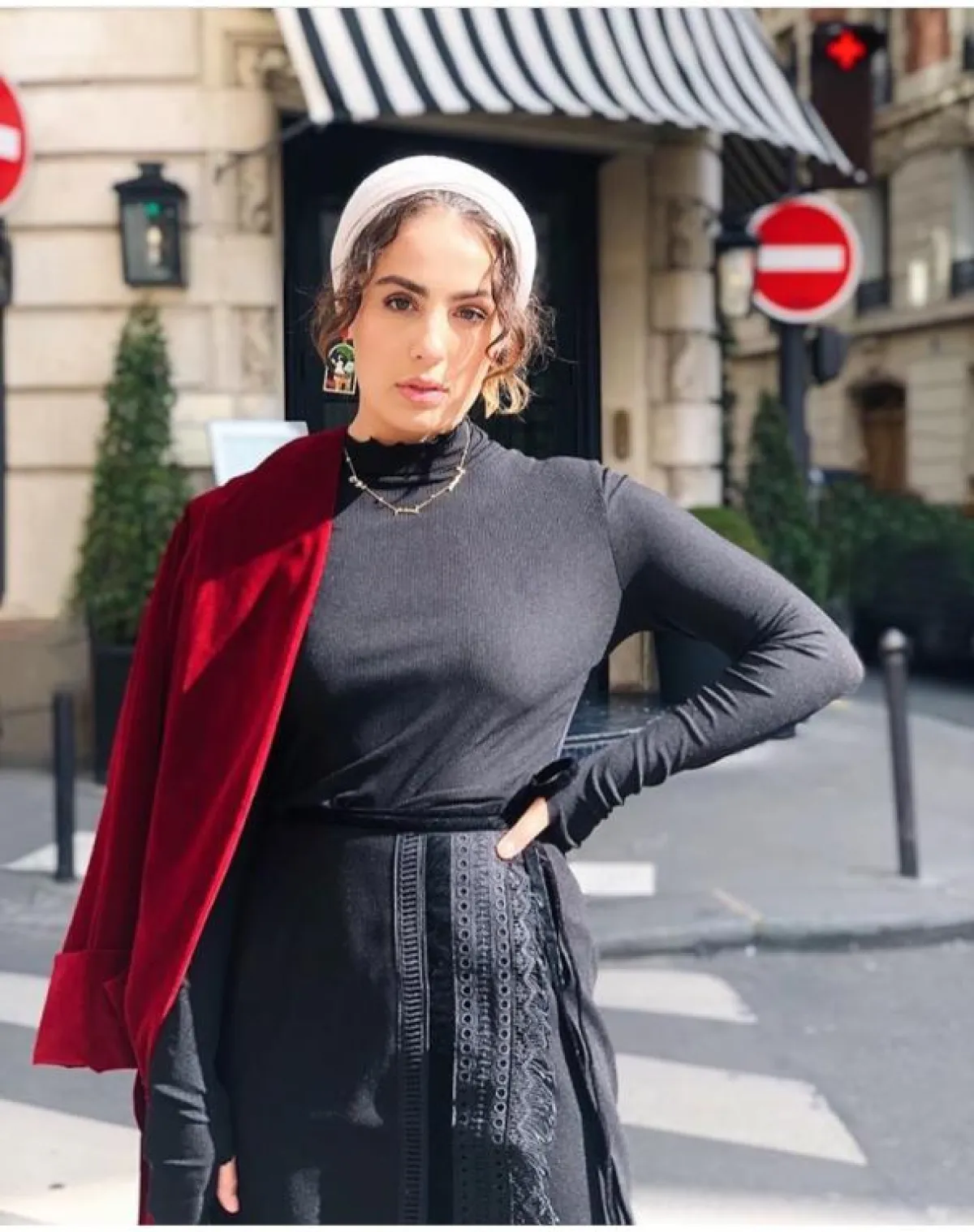 اختارت مدونة الموضة آسيا اطلالة غير تقليدية، باختيار الألوان الداكنة للتنورة والتوب الأسود، نسقت معهما التوربان الأبيض، لم يبدُ مختلفًا أو غير ملائم، بل على العكس، بخاصة بعدما أضافت الجاكيت الأحمر، بإمكانكِ أيضًا اعتماد لفات الحجاب باللون الأبيض بهذه الطريقة.