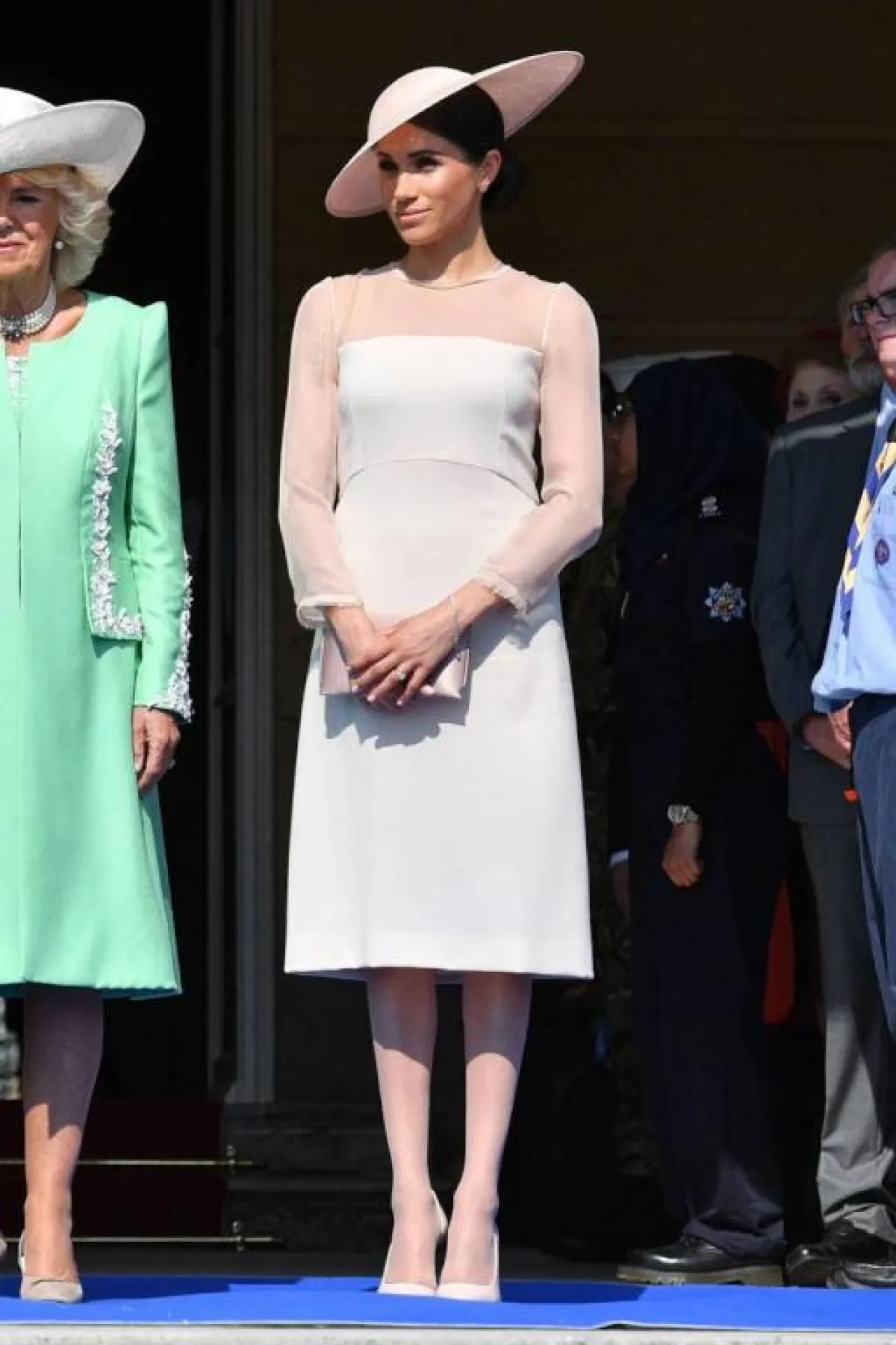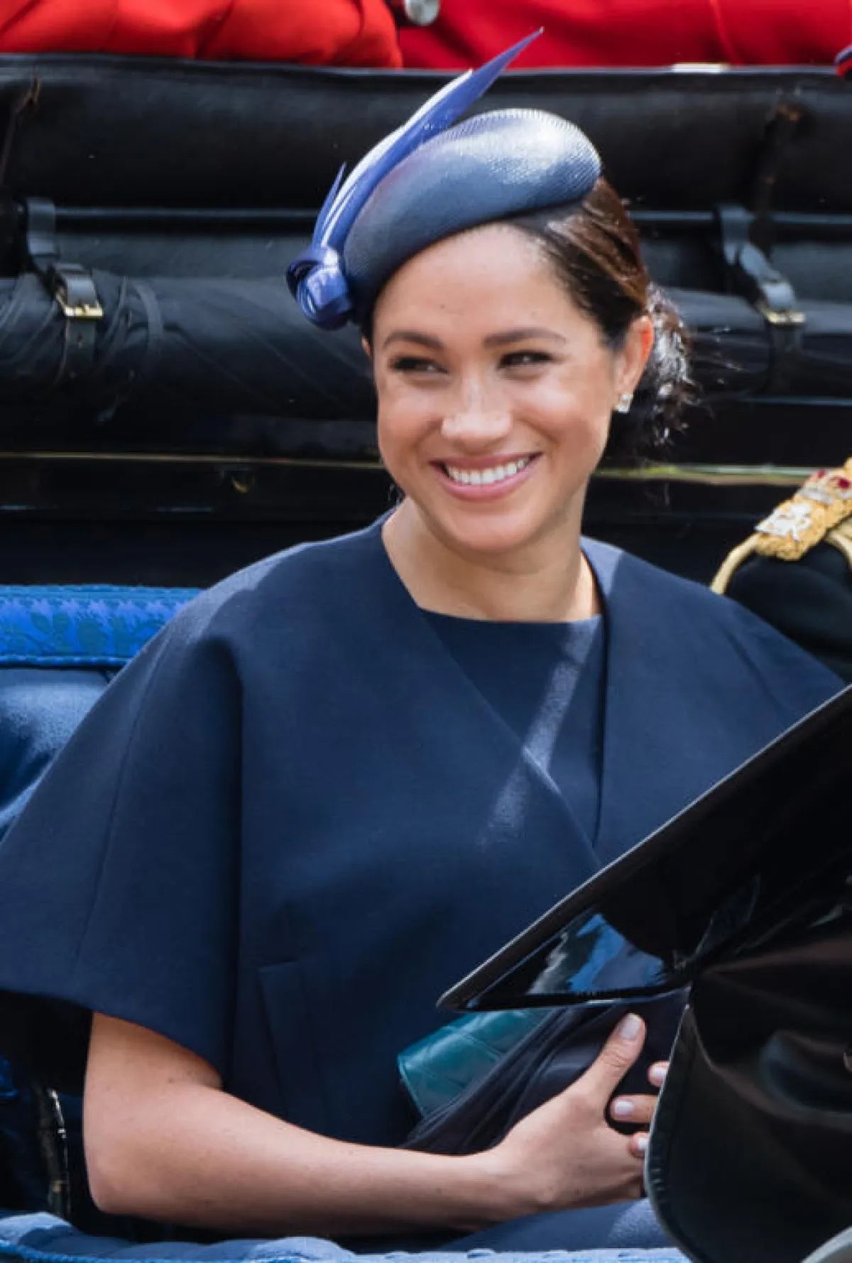 شاهدنا ميغان ماركل Meghan Markle في أحد الاحتفالات الرسمية بعد الولادة، وقد اختارت اطلالة ناعمة باللون الأزرق الكحلي، كانت عبارة عم فستان ميدي ناعم بأكمام متوسطة الطول، ونسقت معه قبعة بتصميم مبتكر، وشنطة يد صغيرة من الجلد باللون الأزرق التركواز، وزينت اللوك بأقراط ماسية ناعمة.
