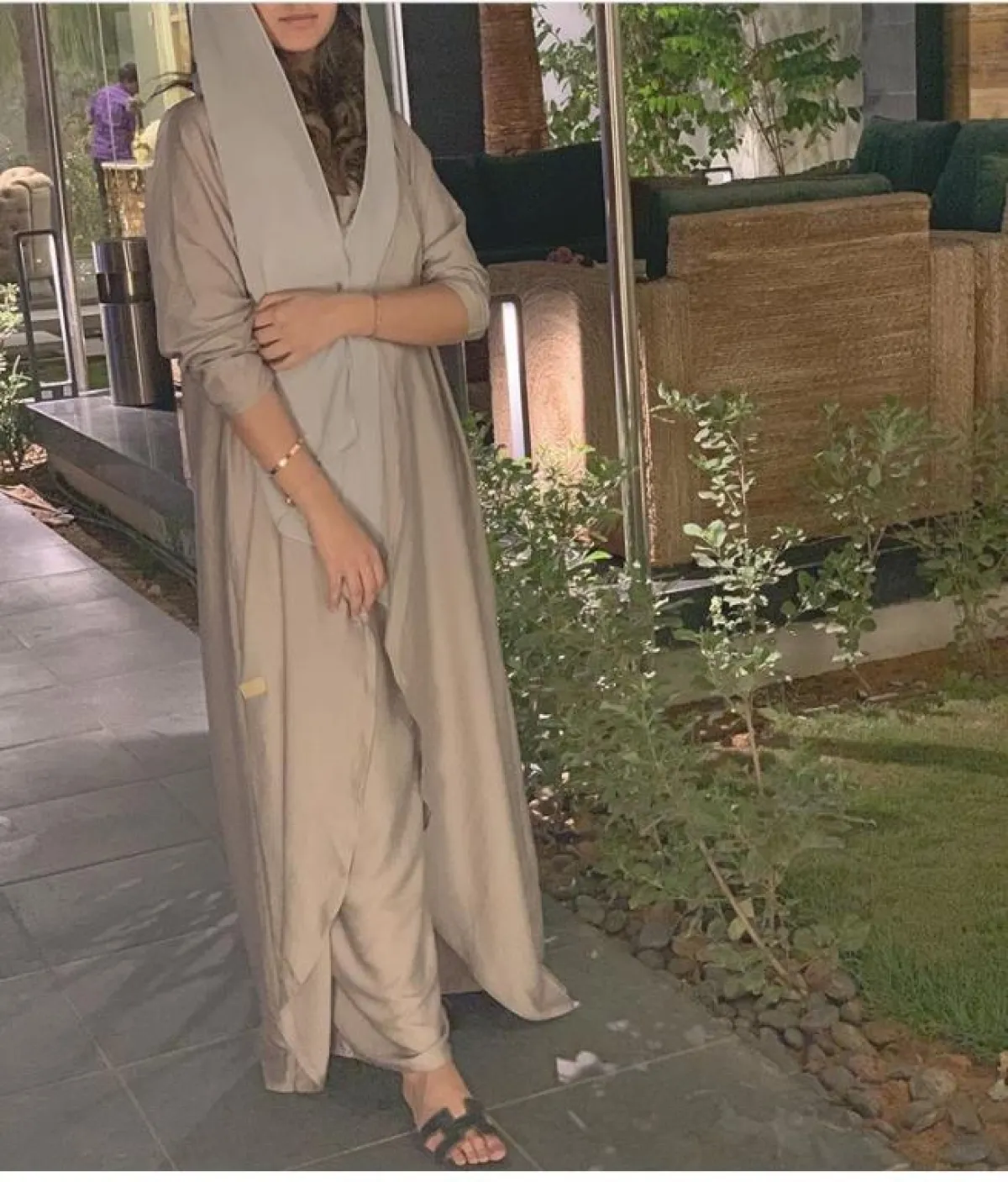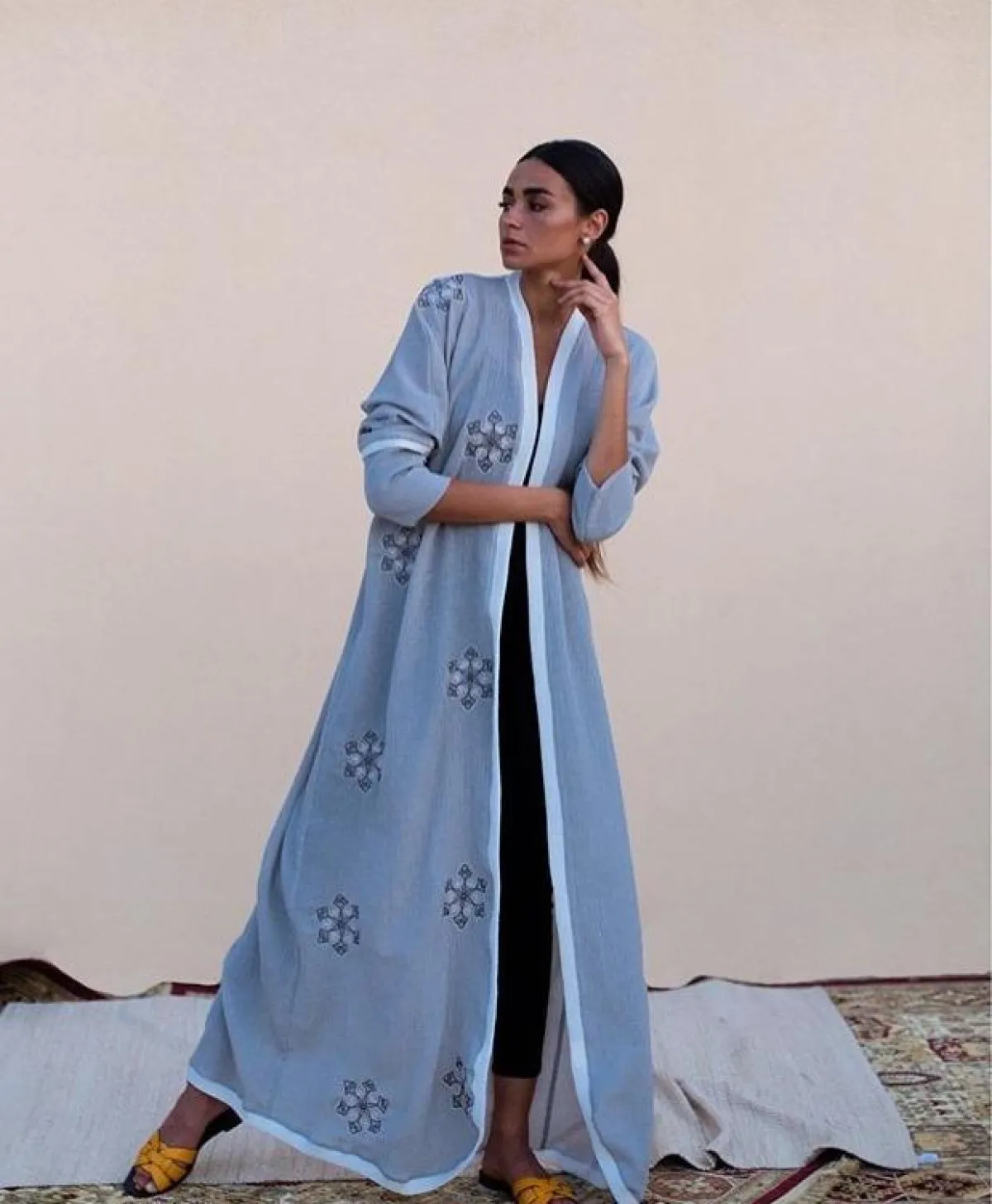 اعتماد موديلات الجلابيات غير المفتوحة من الأمام، من الممكن أن تختاريها كعباية استقبال، لحفلاتكِ البسيطة بالمنزل، أو بالمناسبات، عادة ما تكون هذه الجلابيات بخامات مريحة لسهولة حركتكِ بالمنزل، كهذه العباية من Bakarah Abayas بكارا عباياس، نسقيها مع حجاب باللون الأبيض، وسليبر أو شبشب مفتوح، لا سيّما من علامة هيرميس Hermes الشهيرة.