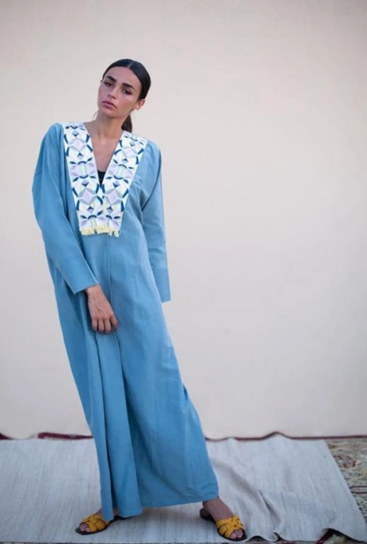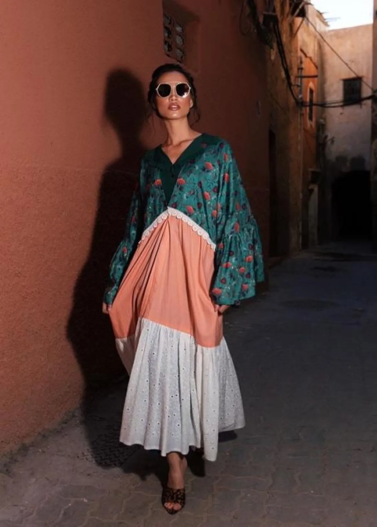 هذا الستايل الجريء من الجلابيات مازال محافظًا على قيمته إلى الآن، قد يتغير التصميم لكنّ الفكرة مازالت أساسية، كهذا التصميم من أيوا لندن Aywa London، للجلابية المتدرجة بالأقمشة المختلفة، مع ألوان متداخلة، يفضل أن تنسقي معها حذاء الميول البسيط جدًّا، لا سيّما من الخوص، وحقيبة Basket Bag صيفية تمنحكِ "لوك" شبابيًّا بلمسة جنونية.