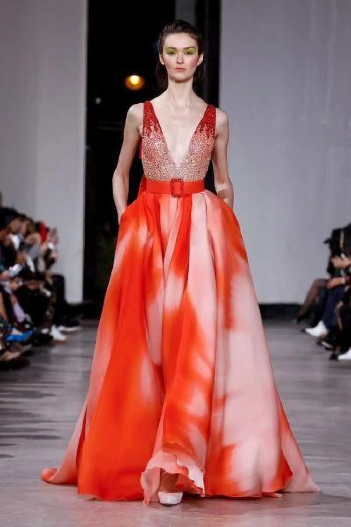 أيضاً برز الفستان البرتقالي مع الأبيض في عرض أزياء جورج شقرا Georges Chakra بتصميم عصري.