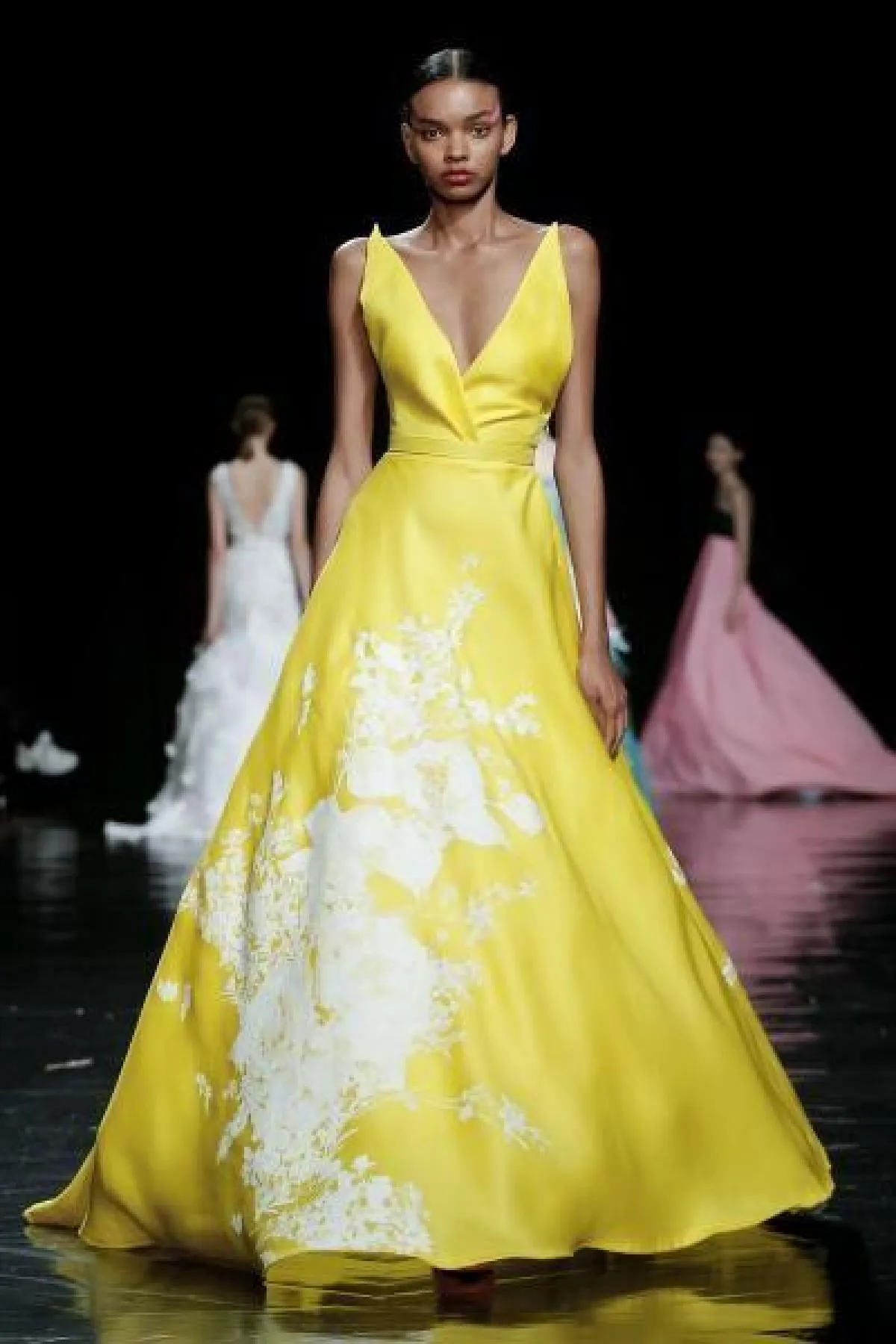 وبرزت الفساتين باللون الأصفر، فهو من أحدث ألوان الموضة الرائجة في المناسبات وليوم الخطوبة أيضاً، فقدمت ماركة Celia Kritharioti فستان أسفل منفوش ومزين بالورود البيضاء.