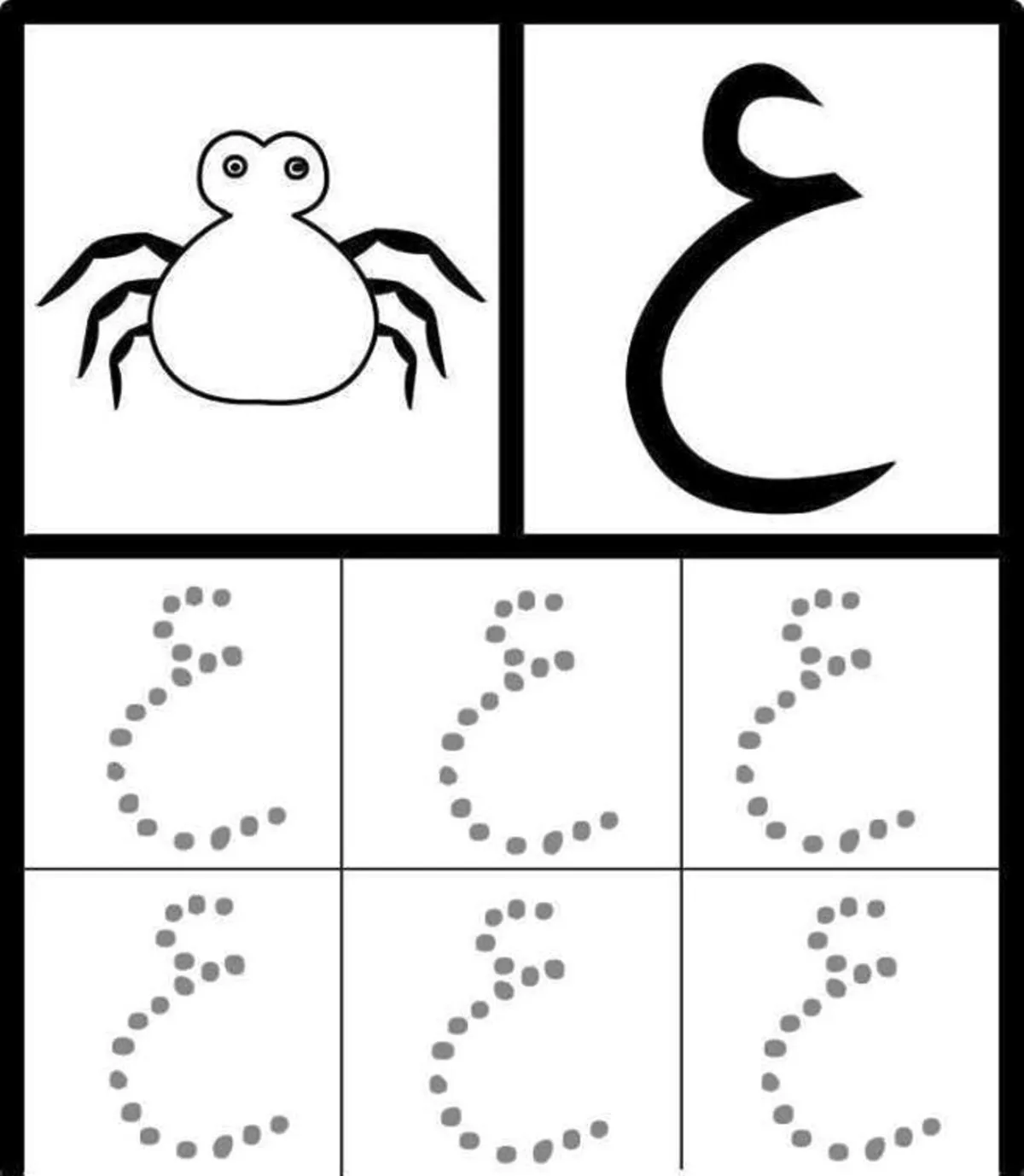 حرف العين يمتلك أخاً لا يختلف عنه سوى بنقطة فوق رأسه، ولذلك سيكون عليك تعليم الطفل الحرفين متتاليين بسهولة، فمتى تعلم حرف العين، سوف يكتب حرف الغين بسرعة، ولذلك عليك اتباع الخطوات التالية: