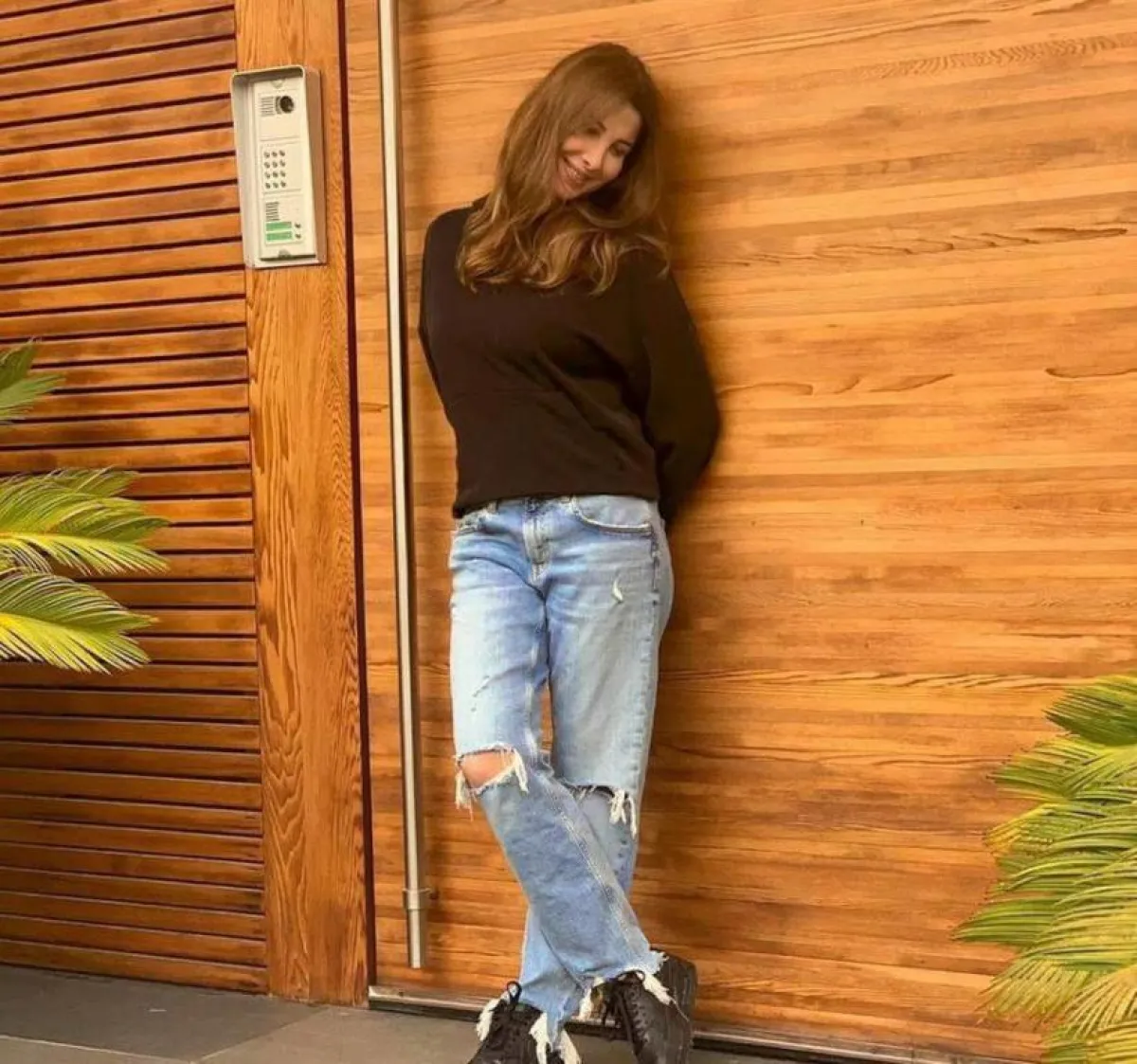 اعتمدت نانسي عجرم اطلالة رياضية جمعت من خلالها بين الجينز الممزّق مع كنزة شتوية من اللون الأسود وحذاء رياضي من اللون نفسه .