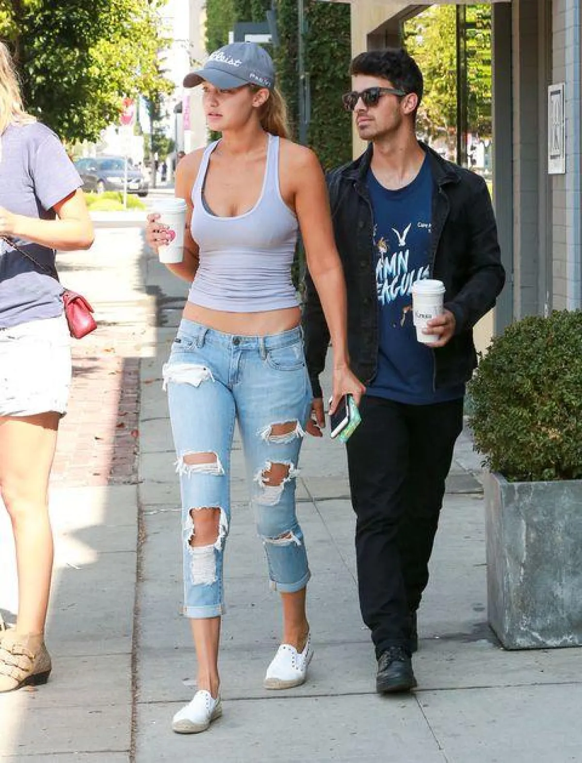 نسّقت جيجي حديد سكيني جينز ممزّق مع حذاء مسطّح من اللون الأبيض وتيشيرت من اللون نفسه. أضافت قبّعة رياضية لأزيائها ممّا جعل من اطلالتها صيفية وكاجوال.