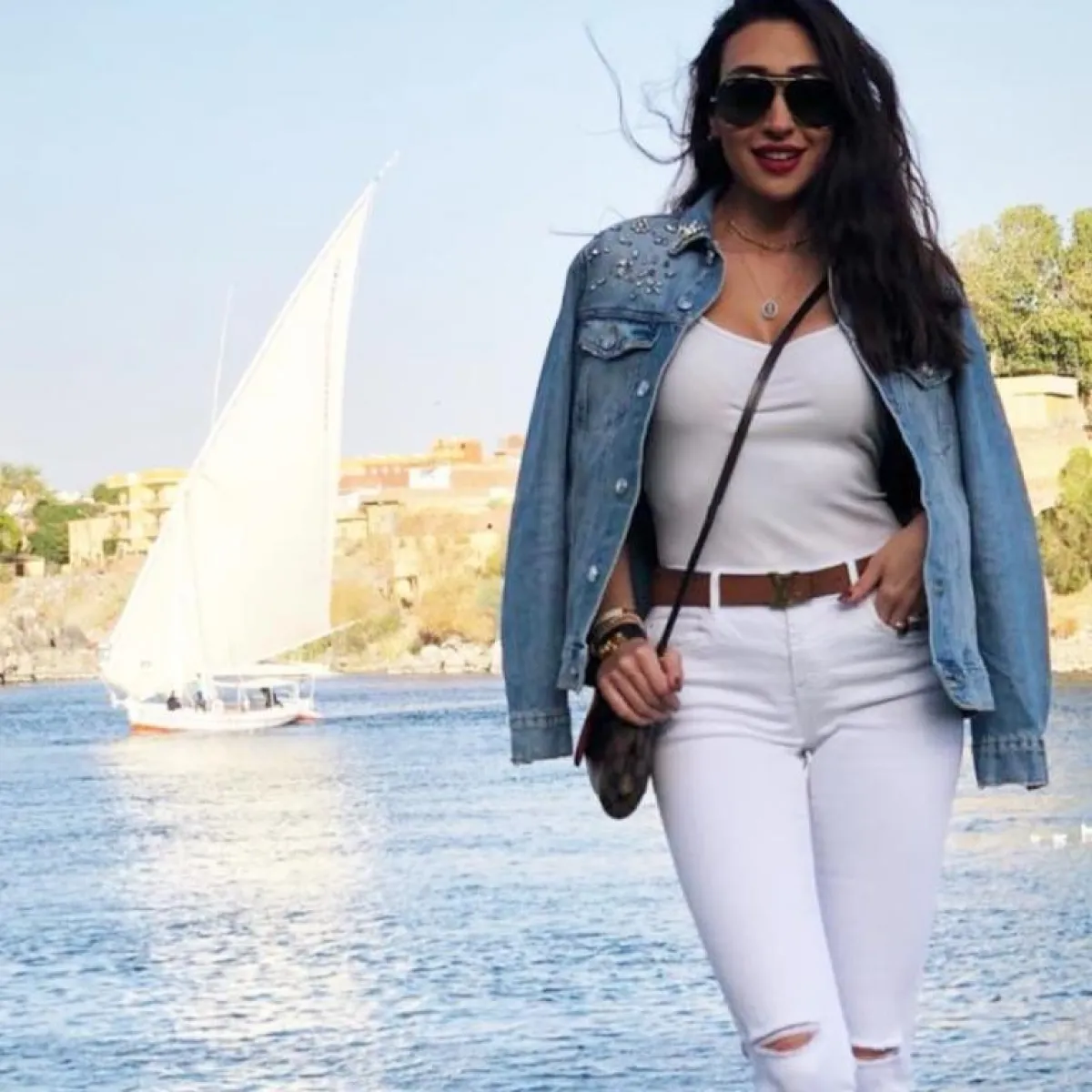 و باطلالة نهارية كاجوال، نسّقت ياسمين صبري الجينز الممزّق مع حذاء رياضي من اللون الأبيض وجاكيت مورّد من اللون الزيتي.