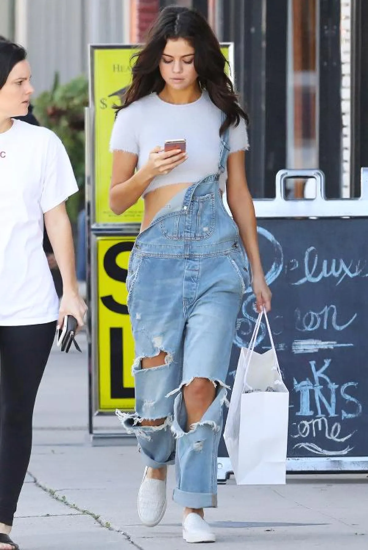 اعتمدت المغنيّة الأميريكية سيلينا غوميز صيحة الجمبسوت الدنيم الممزّق خلال اطلالة نهارية ونسّقت معه حذاء رياضياً أبيض وكروب توب من اللون نفسه لإطلالة كاجوال.