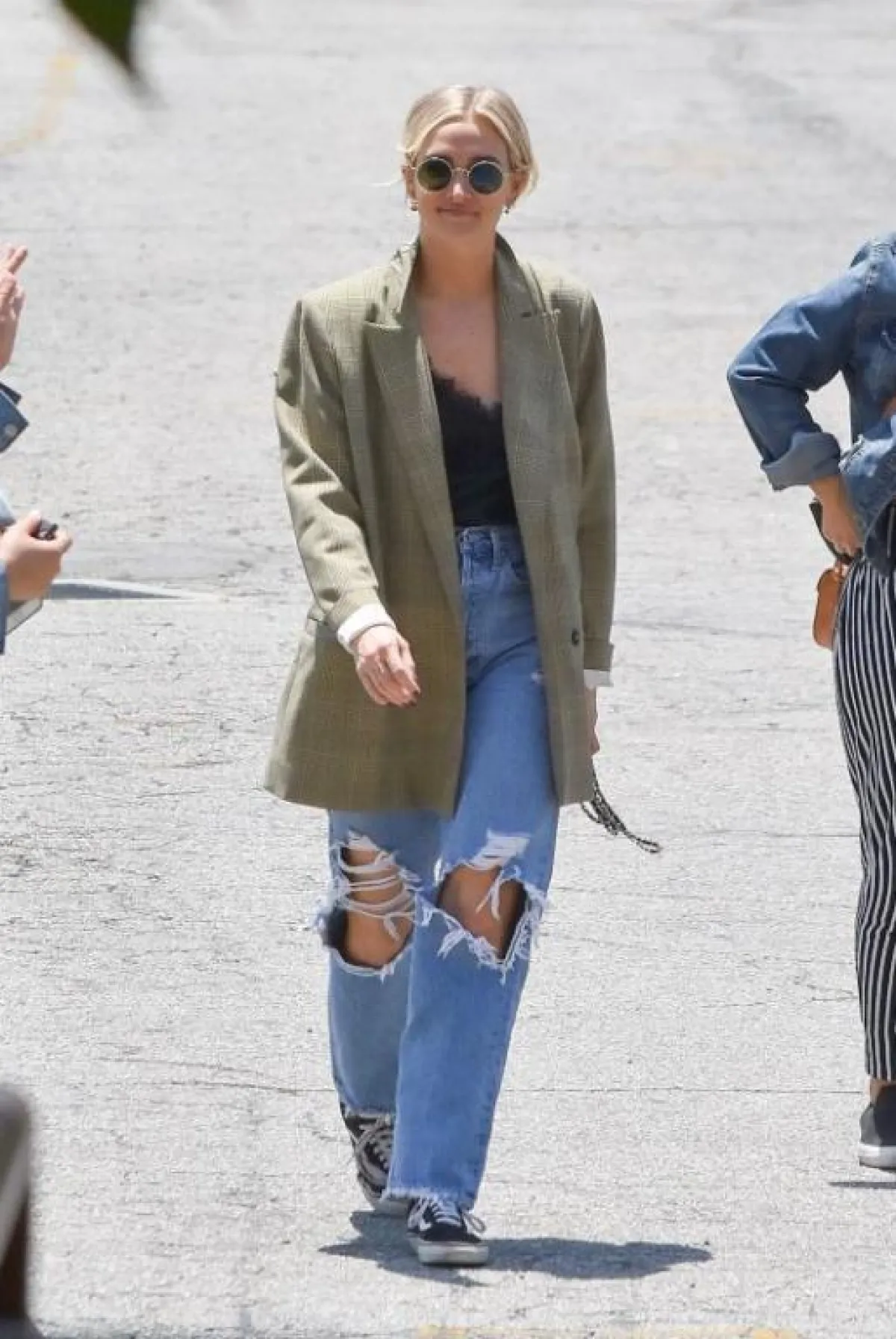 أطلّت أشلي سيمسن باطلالة الجينز الواسع الممزّق ونسّقته مع حذاء رياضي من اللون الأسود وبليزر من صيحة الكاروهات مع توب أسود .