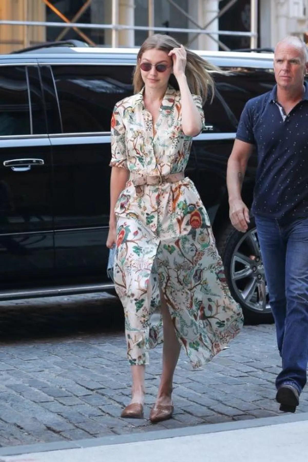 خلال اطلالة نهارية أخرى، ارتدت جيجي صيحة القميص الفستان من اللون الأبيض المورّد، مع حزام يضمّ الخصر، وشبشب بمقدّمة مدببّة.