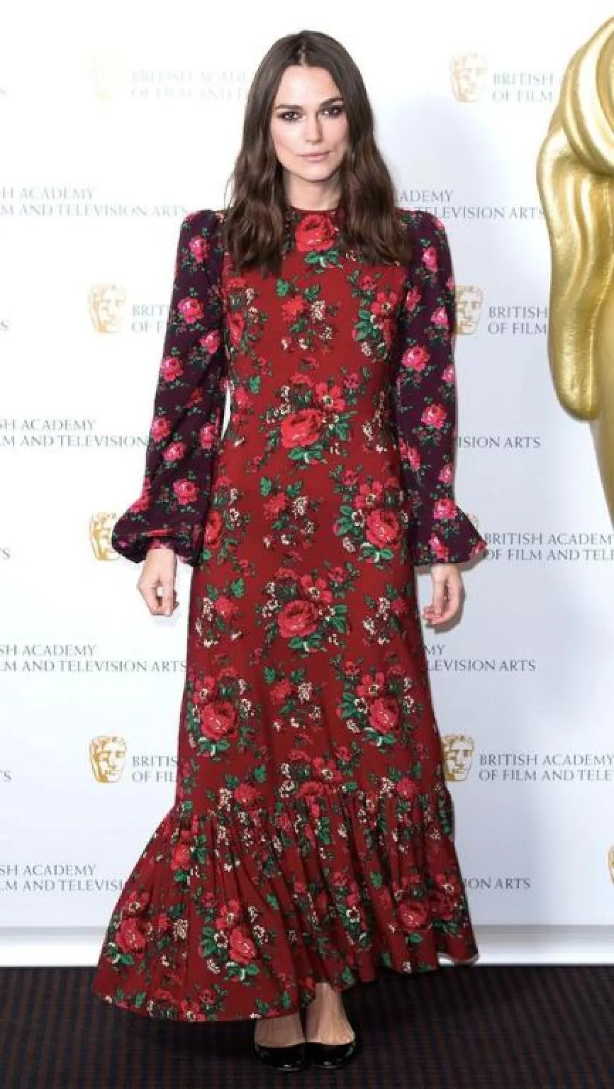 أعجبتنا اطلالة كايرا نيتلي المسائية بفستان أحمر طويل مورّد، مزيّن بالكشكش من الأسفل، نسّقت معه باليرين من اللون الأسود.