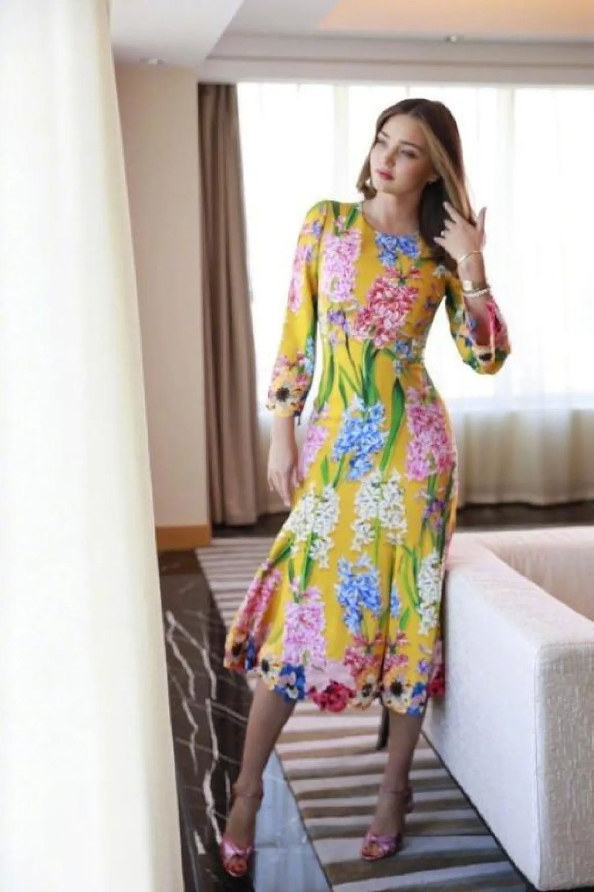 ففي المرّة الأولى نسّقت ميراندا فستان ميدي مورّدًا من اللون الأصفر، مع حذاء وردي بكعب عالٍ .