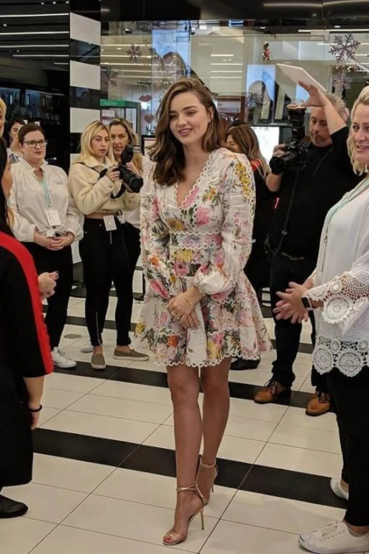 أمّا المرّة الثانية ، فانتقت ميراندا فستان دانتيل أبيض قصيرًا بنقشة الورود، ونسّقته مع حذاء مفتوح بكعب رفيع.