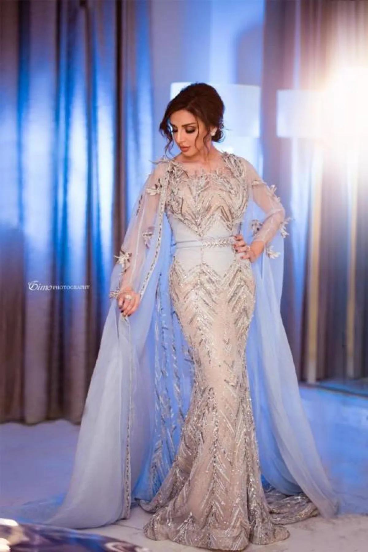 جميع نقاد الموضة متفقون على نجاح التعاون بين أحلام وزهير مراد Zuhair Murad، وهذا الفستان الذي اختارته مؤخرًا لإحياء حفلها في السعودية، دليل جديد على ذلك، مصنوع من قماش التول المطرز بالترتر والخيوط الفضية البراقة، بقصة فاخرة ومحتشمة مستوحاة من فساتين الأميرات، مع حزام معدني يزين الخصر.