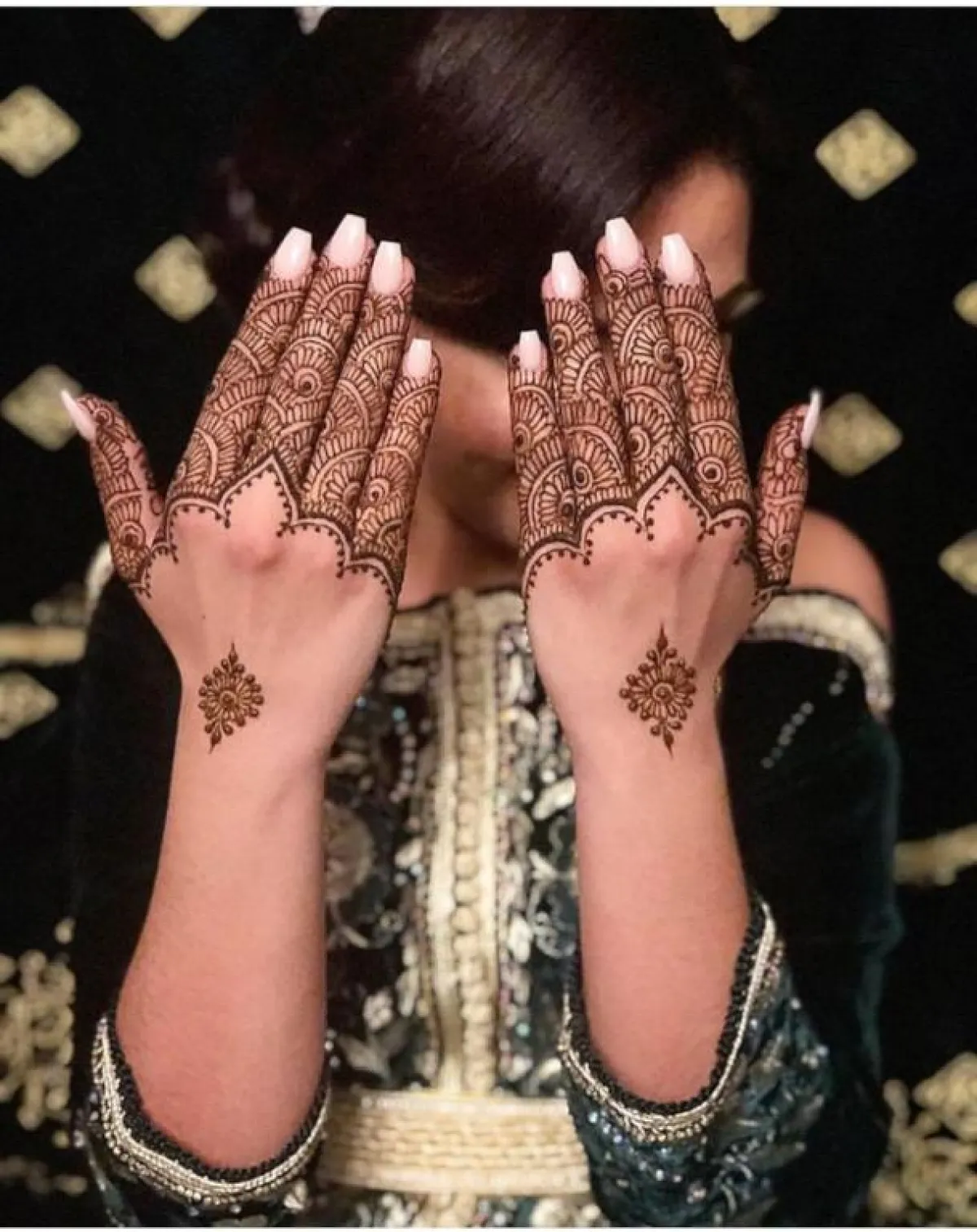من الممكن أن ترسمي الحنّاء على كف اليد فقط، مع التركيز على اللون الداكن لأظافر، للمسة مميزة ومختلفة، وكأنكِ ترتدين قفازات ناعمة ومخملية.