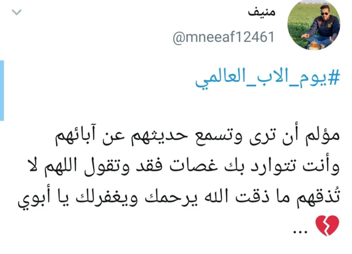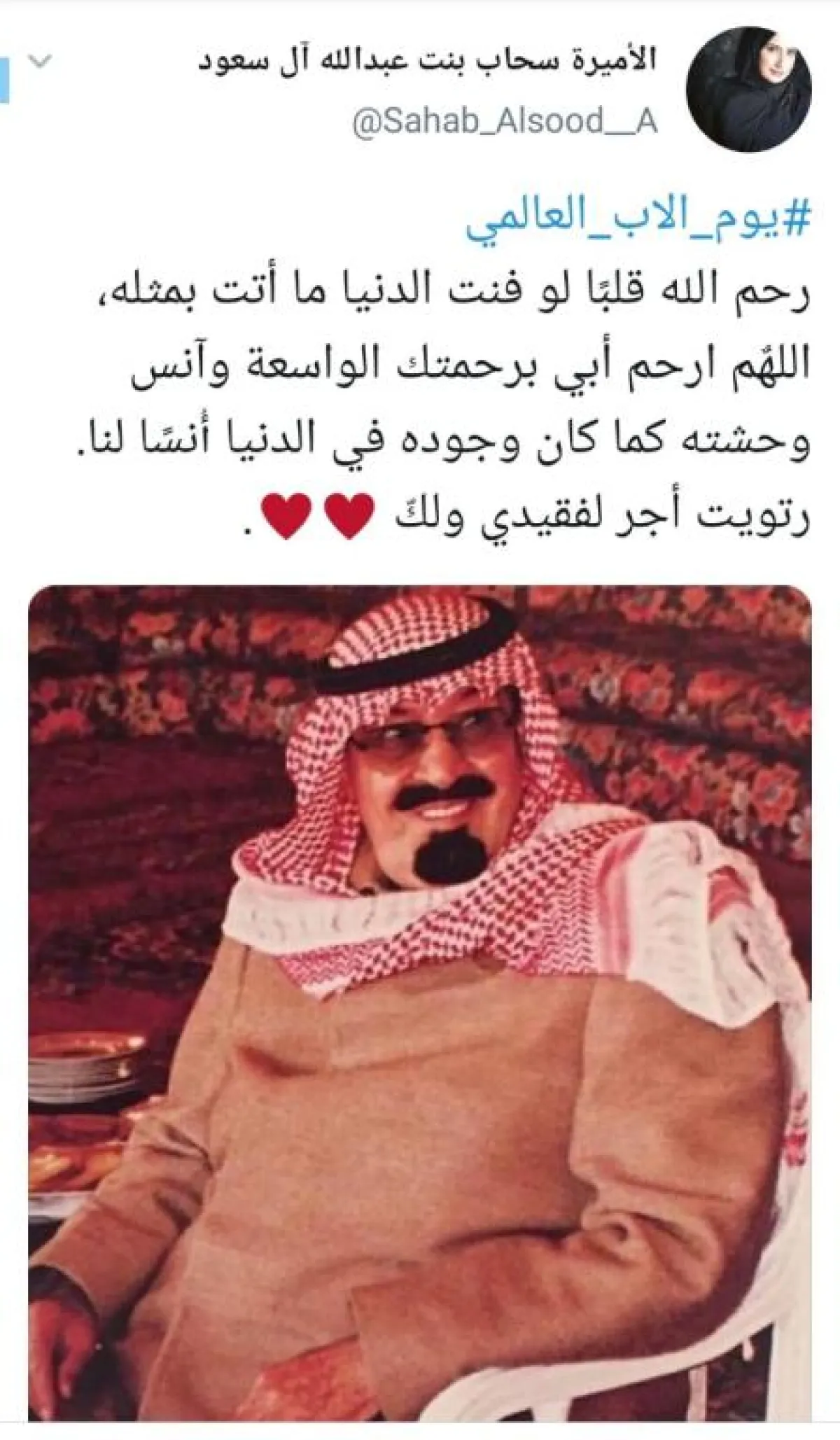 حيث غردت الأميرة سحاب بنت عبدالله آل سعود: «رحم الله قلباً، لو فنت الدنيا ما أتت بمثله. اللهم ارحم أبي برحمتك الواسعة، وآنس وحشته، كما كان وجوده في الدنيا أنساً لنا».وكتب المغرد فيصل راكان بن حثلين مترحماً على والده: «اشتياق عظيم يا أبي. رحم الله وجهك وسائر جسدك عن النار وجمعني الله بك يا أغلى مَن فقدت في جنة الفردوس الأعلى». كذلك عبَّر المغرد منيف عن عظيم فقدانه والده: «مؤلم أن ترى وتسمع حديث الجميع عن آبائهم، وأنت تتوارد بك غصات فقط، وتقول اللهم لا تذقهم ما ذقت، الله يرحمك ويغفر لك يا أبي». بينما قالت المغردة ريم معبرة عن حبها وعرفانها لوالدها: «دمت عزيزي وعزتي، فأنت حبيبي الأول وعيني الثالثة، وملجئي بعد الله. طاب بك العمر يا سيد الرجال وطبت لي عمراً يا أبي».