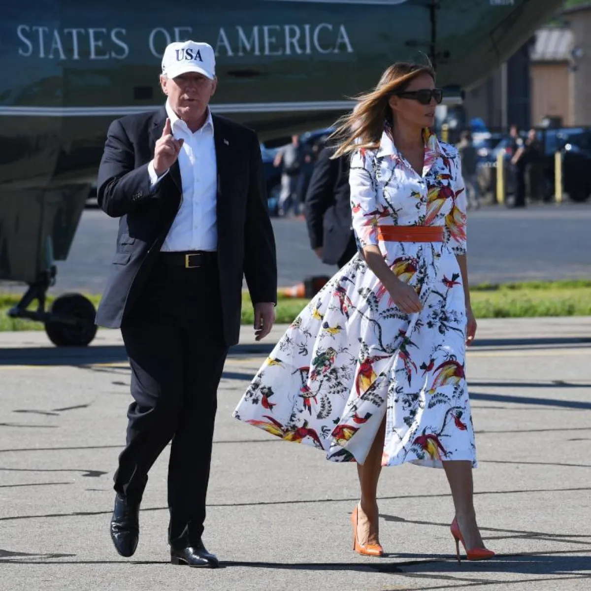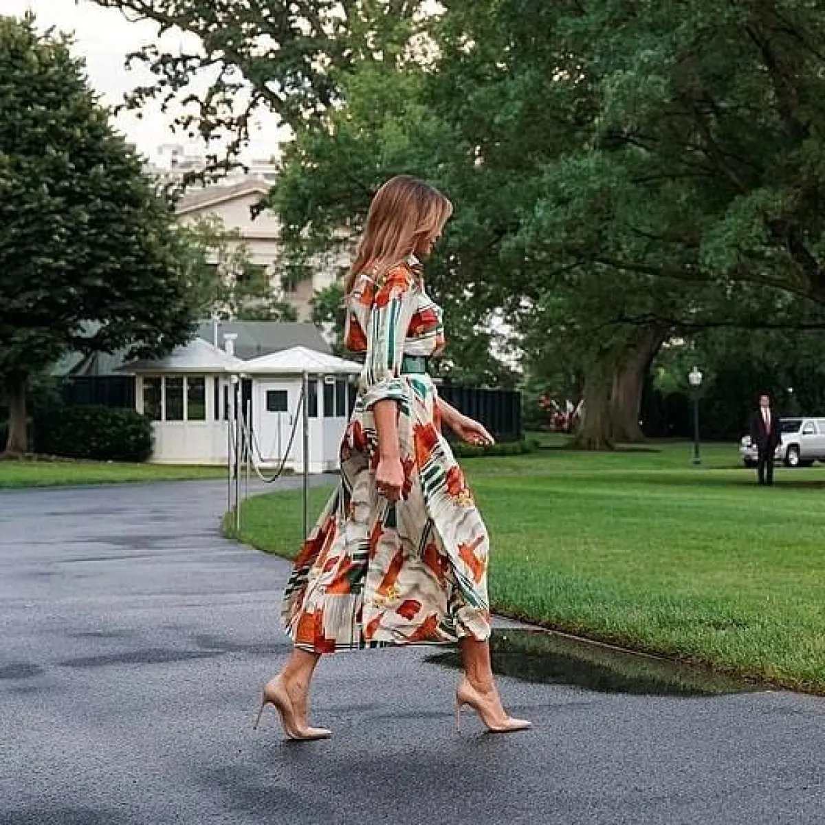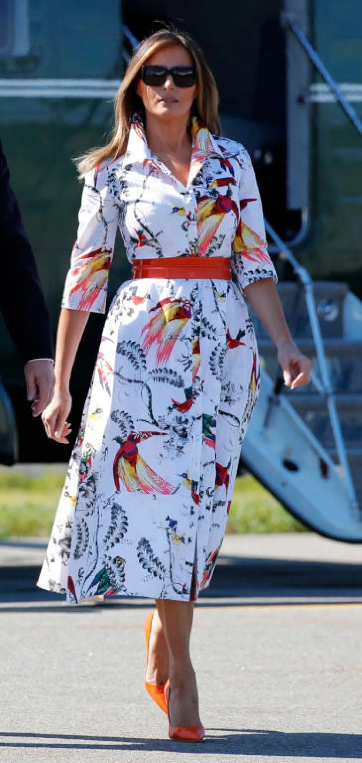 لا تكتفي ميلانيا ترامب بفستان القميص بلون موحد أو خطوط بسيطة، بينما تذهب إلى طبعات أنيقة مستوحاة من الطبيعة. ظهرت منها بفستان مطبع بالطيور والأشجار وكأنه مستوحى من الغابات، ميزته أيضًا الورود الربيعية بدرجات الأحمر والبرتقالي، التي سطعت على الخلفية البيضاء، ضمّته بحزام برتقالي برز مع حذاء الـ pump باللون نفسه.