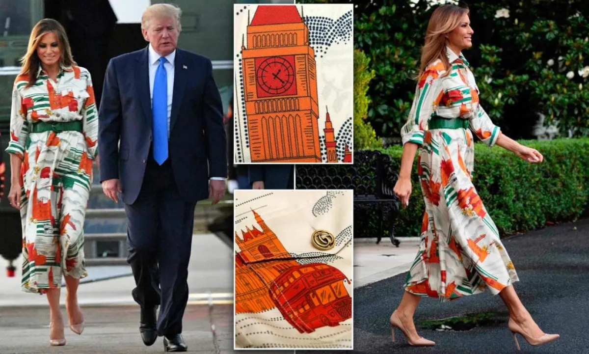 من أكثر الاطلالات الأنيقة التي اعتمدتها ميلانيا ترامب في الآونة الأخيرة، كان فستان غوتشي المطبع بمعالم لندن، مثل ساعة بيغ بن، ومجلسي البرلمان، وأيضًا حافلات شوارع لندن.