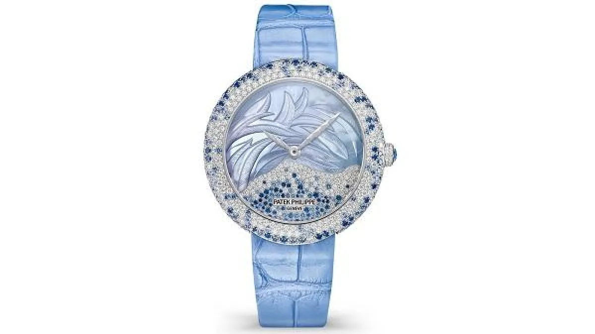 إذا كنتِ تبحثين عن التصاميم الراقية والمنعشة في الوقت نفسه، توجهي نحو اختيار ساعة Calatrava Haute Joaillerie من علامة باتيك فيليب Patek Philippe، فهي ذات تصميم من الذهب الأبيض ومرصعة بالألماس وأحجار الياقوت الأزرق ومينا من اللؤلؤ.