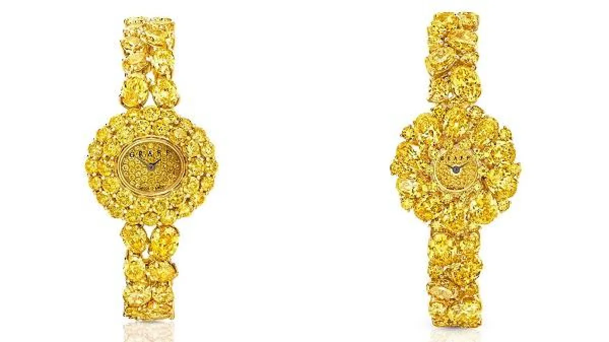 اخترنا لكِ من دار غراف Graff الرائدة في تصميم أفخر الساعات، ساعة مصممة من الألماس الأصفر الساحر Fancy Vivid Yellow والذي يعدّ الأغلى ضمن مجموعة الألماس الأصفر.