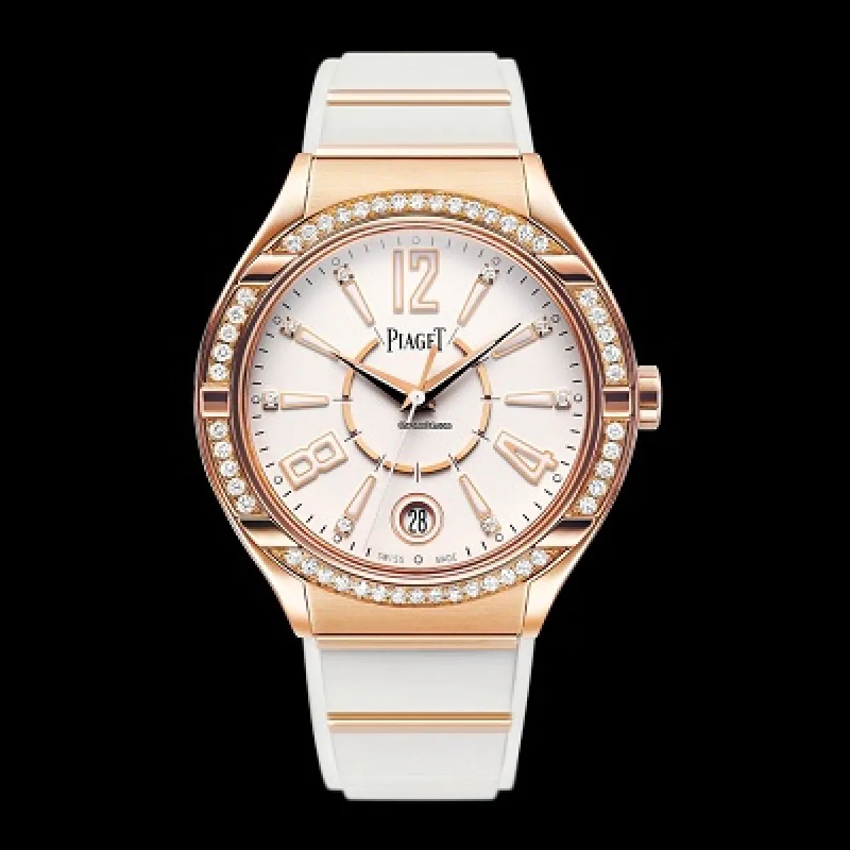 انتقينا لكِ من علامة بياجيه Piaget السويسرية الرائدة ساعة Fortyfive Lady Watch ذات التصميم الرياضي والأنيق. هذه الساعة تم ابتكارها من الذهب الوردي عيار 18 قيراطًا، وهي ذات سوار من المطاط باللون الأبيض، ومرصّعة بالألماس الفاخر لإطلالة كاجوال متألّقة.