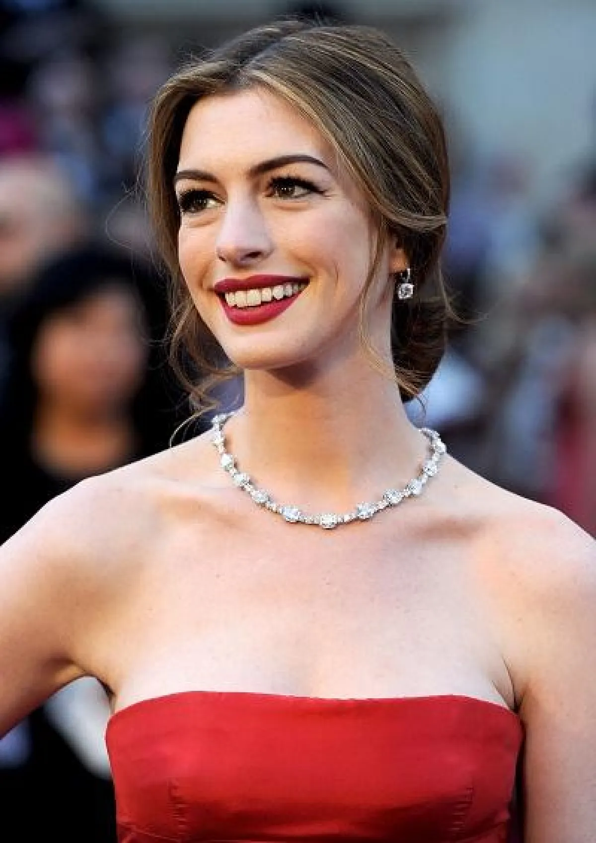 ما من إطلالة يمكنها أن تغطي على تلك التي تميّزت بها النجمة آن هاثاواي Anne Hathaway على السجادة الحمراء متألّقة بقلادة من الألماس Lucida Star من تيفاني آند كو Tiffany &Co وفستان أحمر من فالنتينو Valentino.