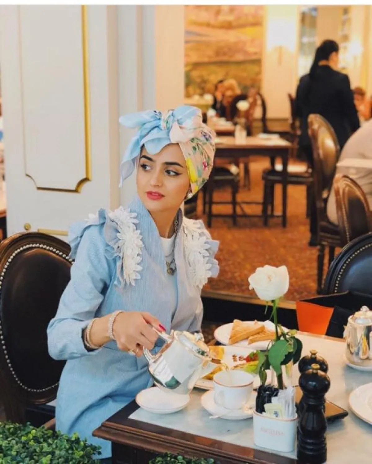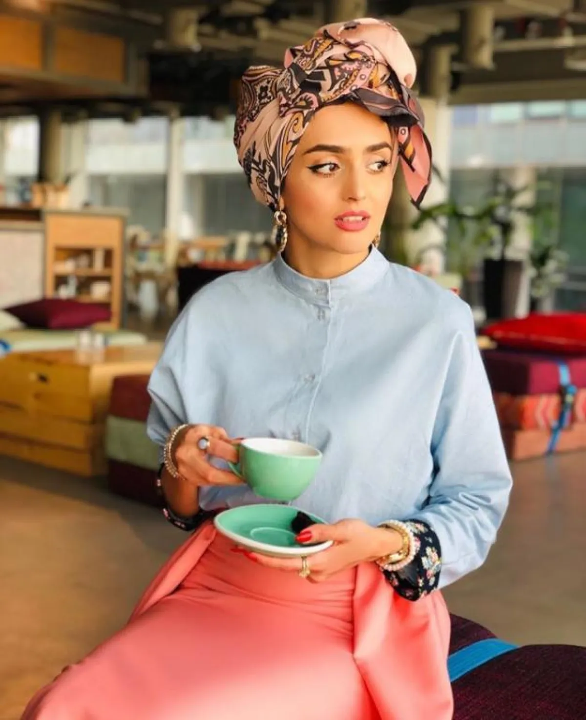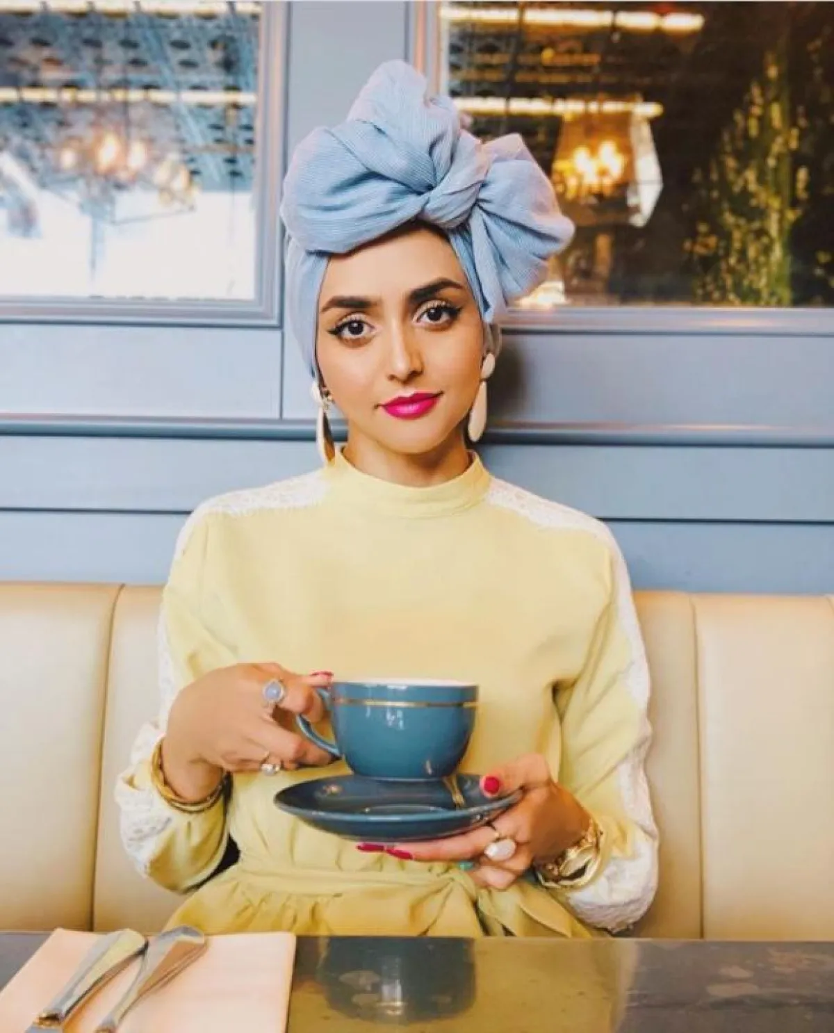 أعجبنا كذلك ألوان الحجابات بالدرجات السماوية، والتي تُعتبر رائجة إلى حد كبير هذا الصيف، من الممكن أن تعتمديها مع بطانة بيضاء، أو يكون الحجاب نفسه ملونًا كالذي اختارته غادة عثمان.