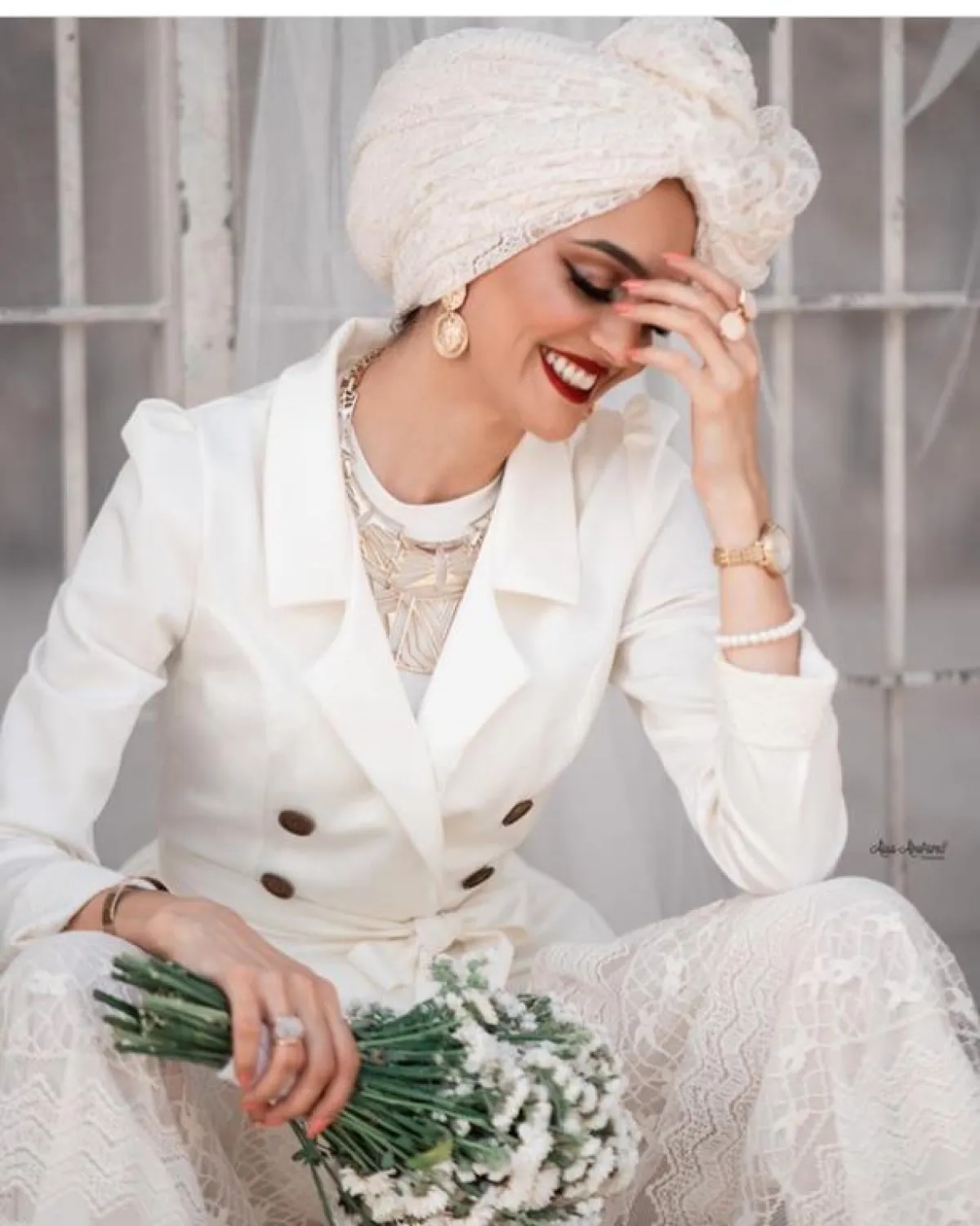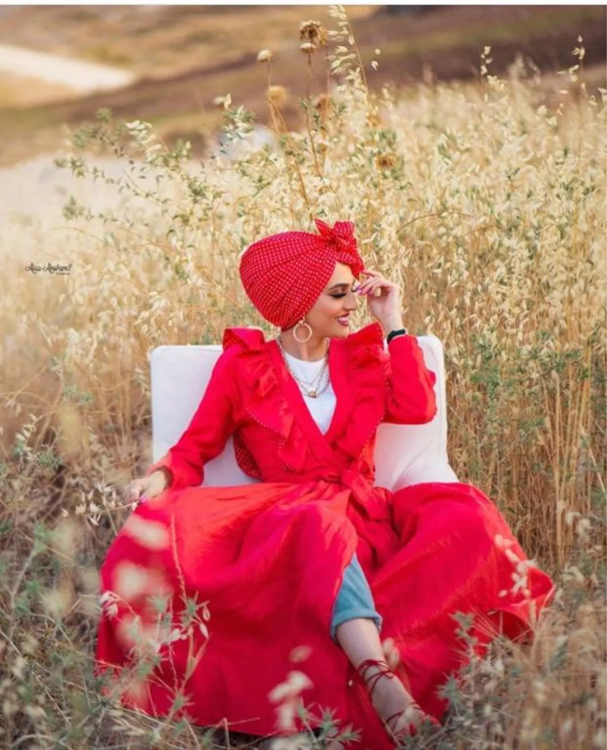 لاطلالة جريئة ومميزة، يمكنكِ اعتماد الحجاب الملون البولكا دوت، كالذي اختارته غادة وربطته بطريقة الفيونكة، لاطلالة حيادية مع فستانها المفتوح، ارتدت معه الجينز ليضيف لمسة من الكاجوال والعصرية للوك.
