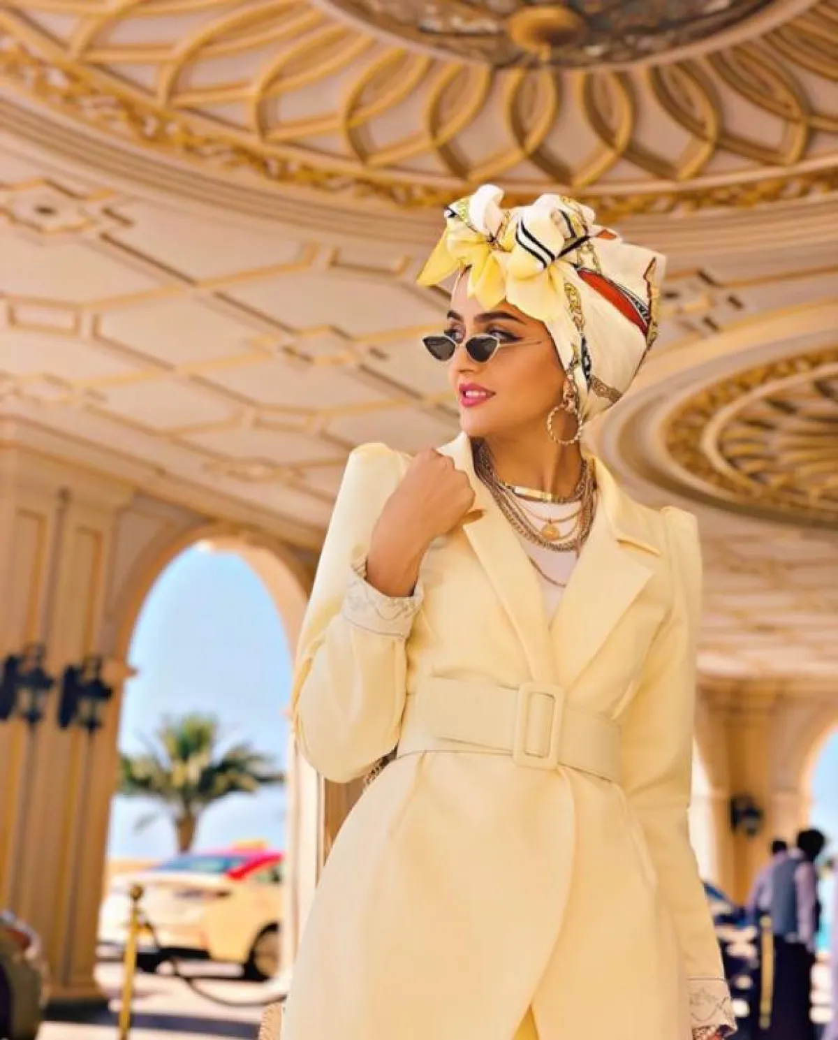 يمكنكِ اعتماد الحجاب الملون مع الرسومات الهندسية، لتمنحكِ اطلالة كلاسيكية، لكنها أيضًا تتناغم مع الملابس الكاجوال العصرية، نسقيها مع البدلة الصيفية الانيقة، كهذا اللوك من غادة عثمان بالبدلة الصفراء، مع الحجاب بألوان الأبيض والأصفر.
