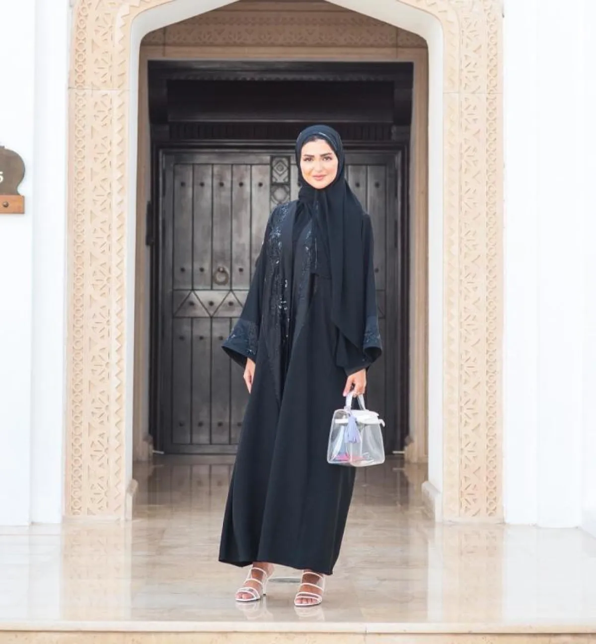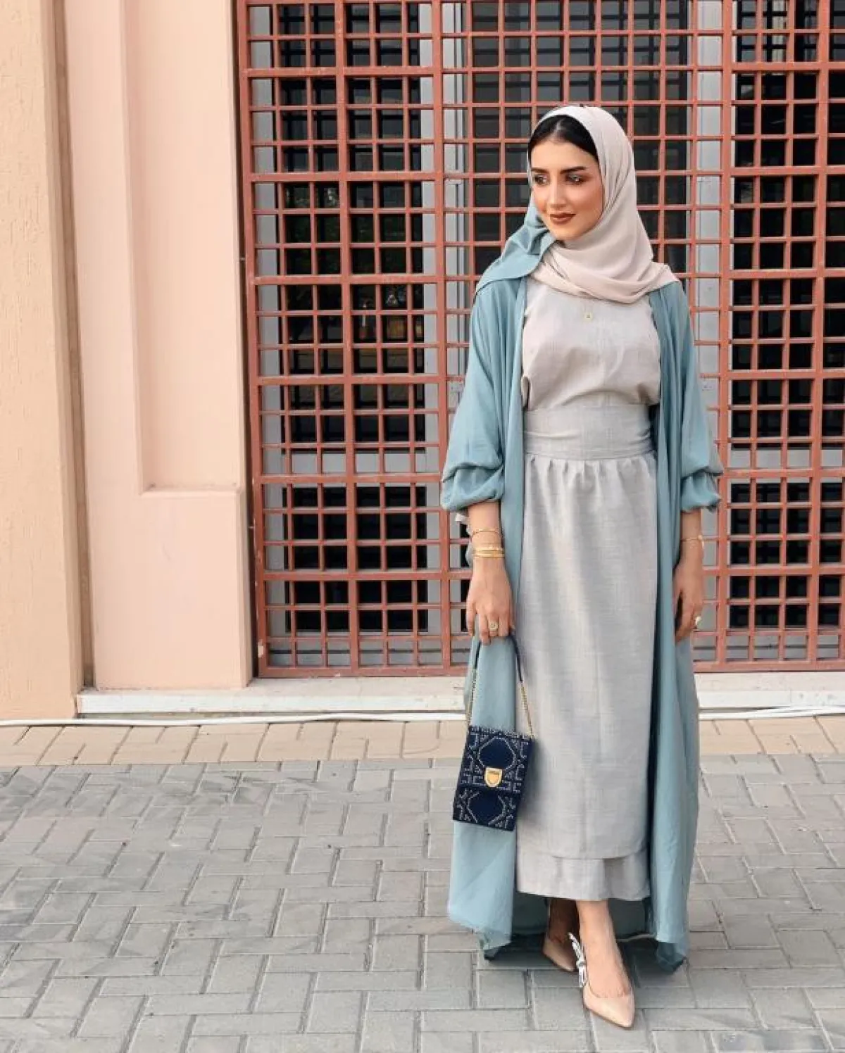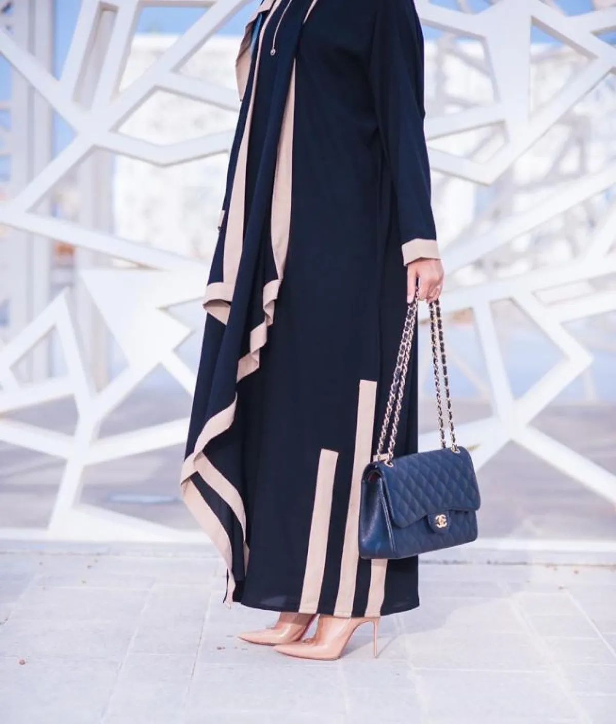 عبايات النود بالألوان الفاتحة من التصميمات العصرية التي لاقت رواجًا كبيرًا في السنتين الماضيتين، وعادةً ما نرشح لكِ أن تختاري أحد اكسسوارات بالألوان ذاتها، لتنسجم مع ستايل العباية، كالحذاء النود الذي اختارته المدونة حنين الصيفي بدرجة الروز، والذي يضيف لكِ طولًا، لهذا ننصح به الصبايا صاحبات القوام الممتلىء، بخاصة وأنّ لونه يشبه إلى حد كيبر لون قدميكِ، ولكنها غيرت في لون الشنطة لاطلالة لافتة أكثر للأنظار.