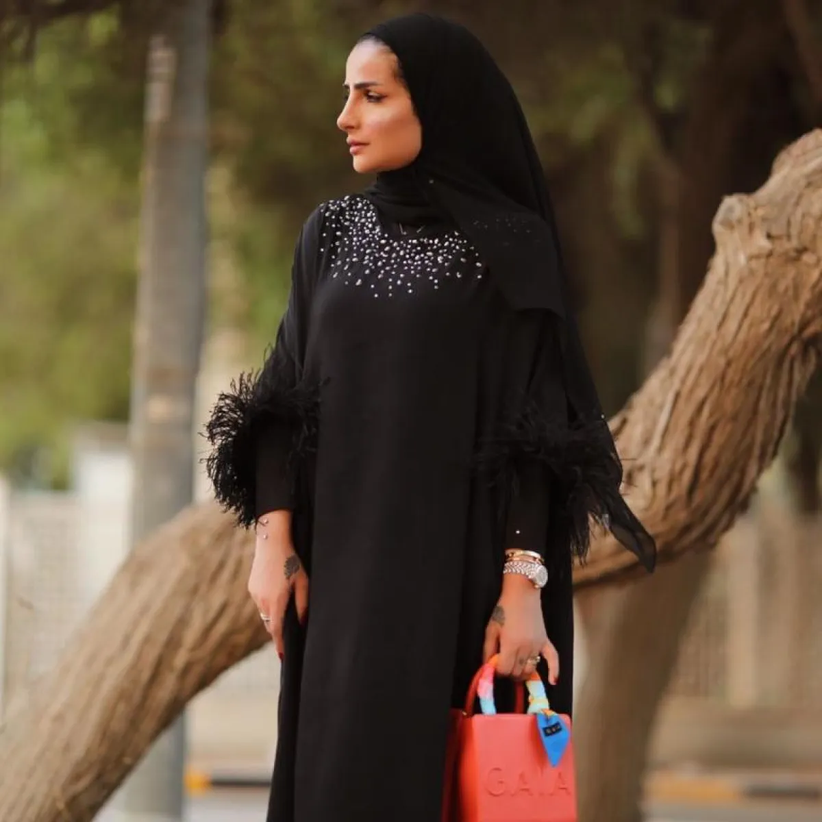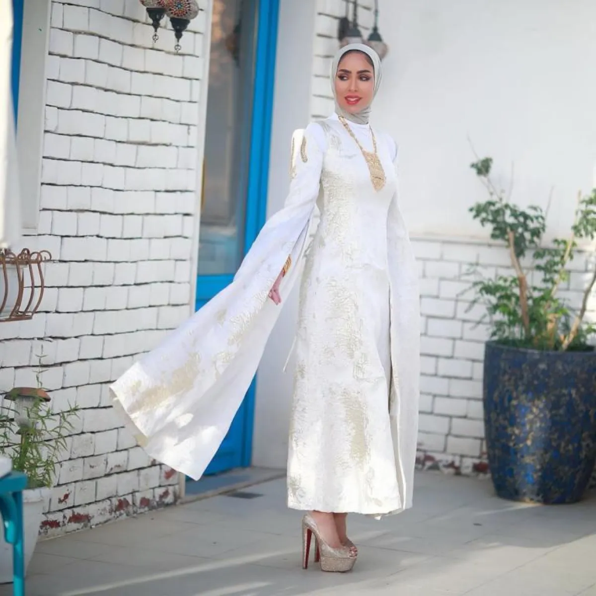 تصميم العباية بحد ذاته، يمنحنا ستايل عربيًّا من الطراز الأول، فلِمَ لا تكملين اللوك بسلاسل الذهب ذات التصميم العربي أيضًا، كالسلسلة التي اعتمدتها المدونة دلال النقبندي مع العباية المطرزة بالورود من الساتان اللامعة.