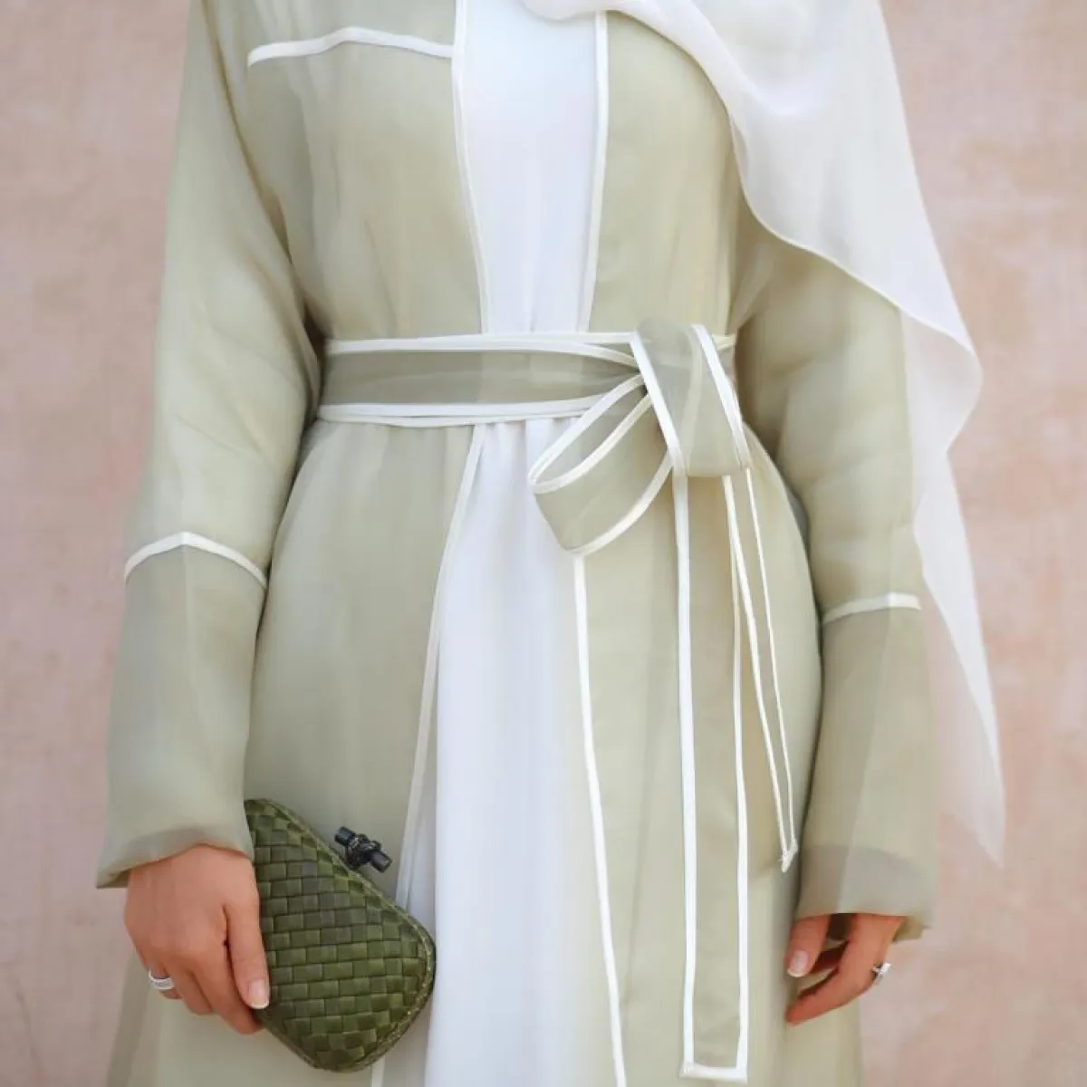 العباية الكلاسيكية أو حتى البسيطة التي ترغبين بارتدائها بطريقة الكلاسيكية، سوف يمنحها الكلتش مظهرًا جذابًا، ومن الممكن أن ترتديه في النهار مع العبايات فاتحة اللون، أو الأبيض الثلجي، كهذه الاطلالة من فاطمة حسام، بالكلتش الأخضر البسيط مع العباية الفاتحة بدرجة أخضر فاتحة.