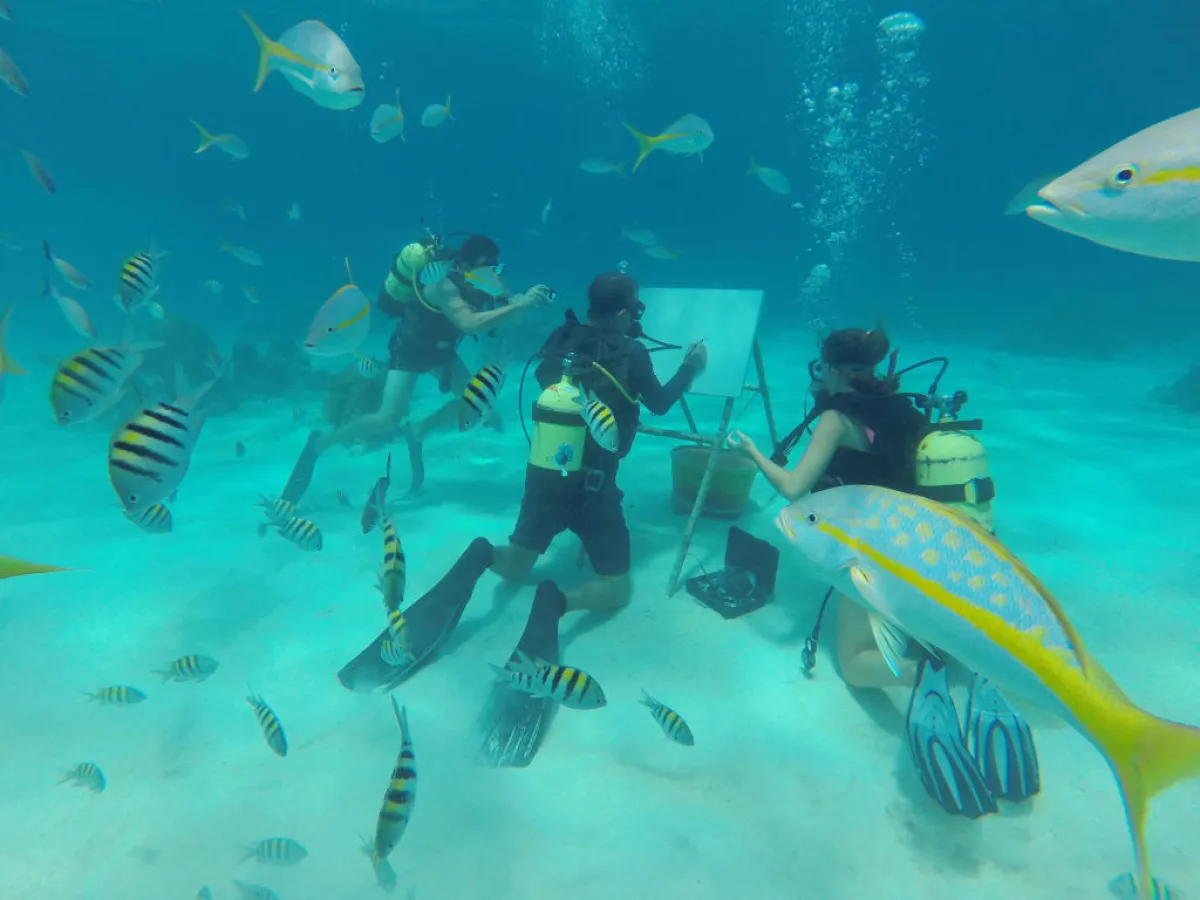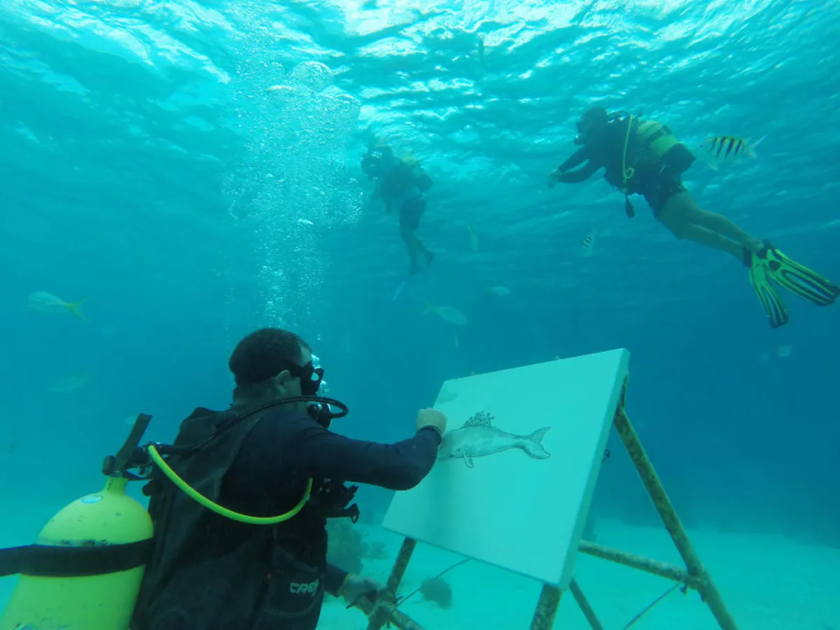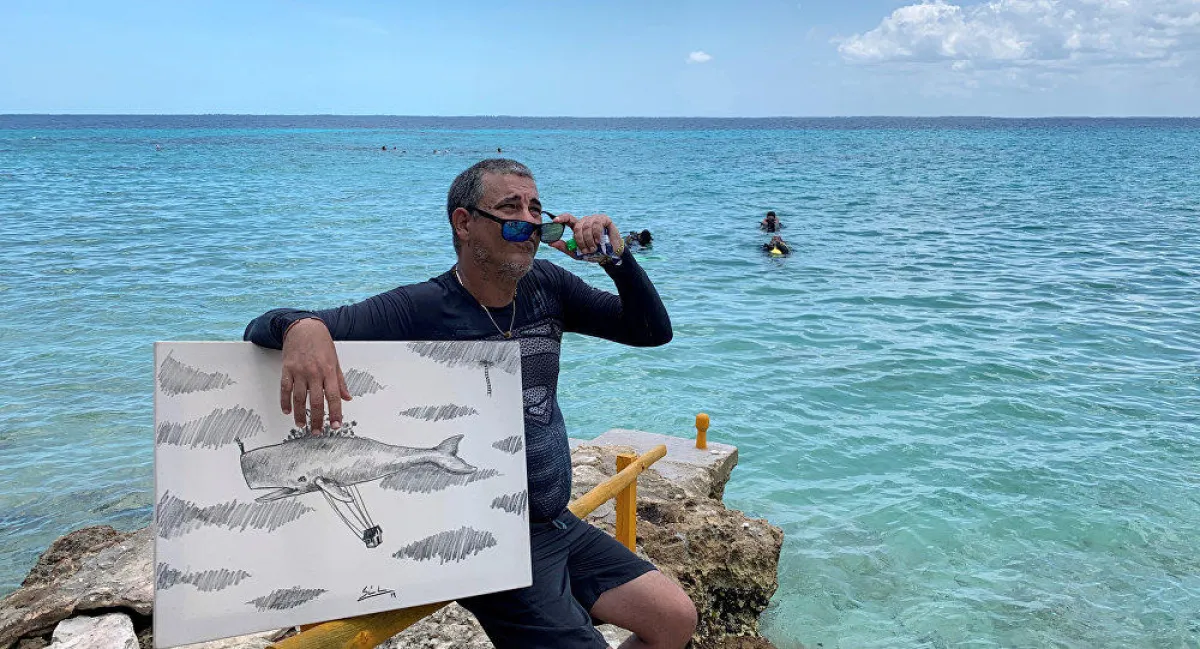الفنان الكوبي ساندور جونزاليس يستمتع بالرسم تحت ماء البحر مع الأسماك الكاريبية