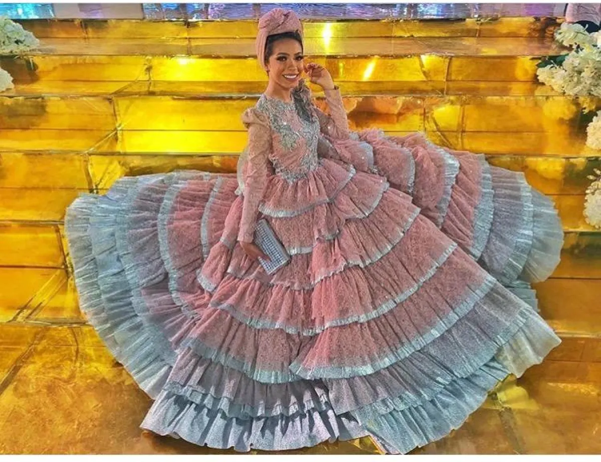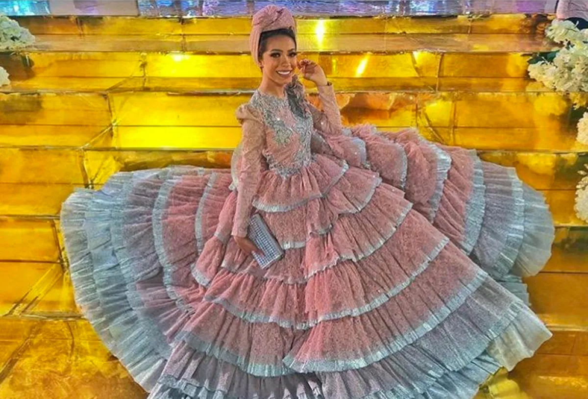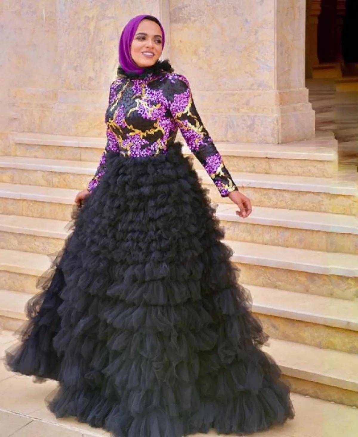 من الممكن أن تعتمدي الفساتين المنفوشة الطبقية، والتي تجعلكِ تبدين أطول، كهذا التصميم من سهر فؤاد للفستان التول الطبقي باللون الأسود، وتوب ملون بدرجات البنفسجي الأنيقة، لتنسقي معه طرحة باللون البنفسجي نفسه من دون أيّ تطريزات.