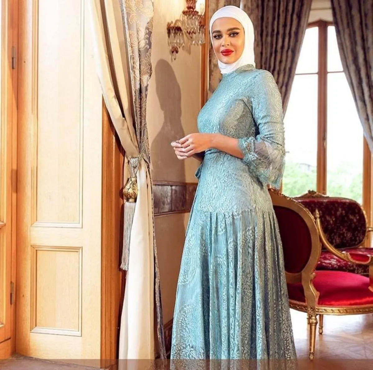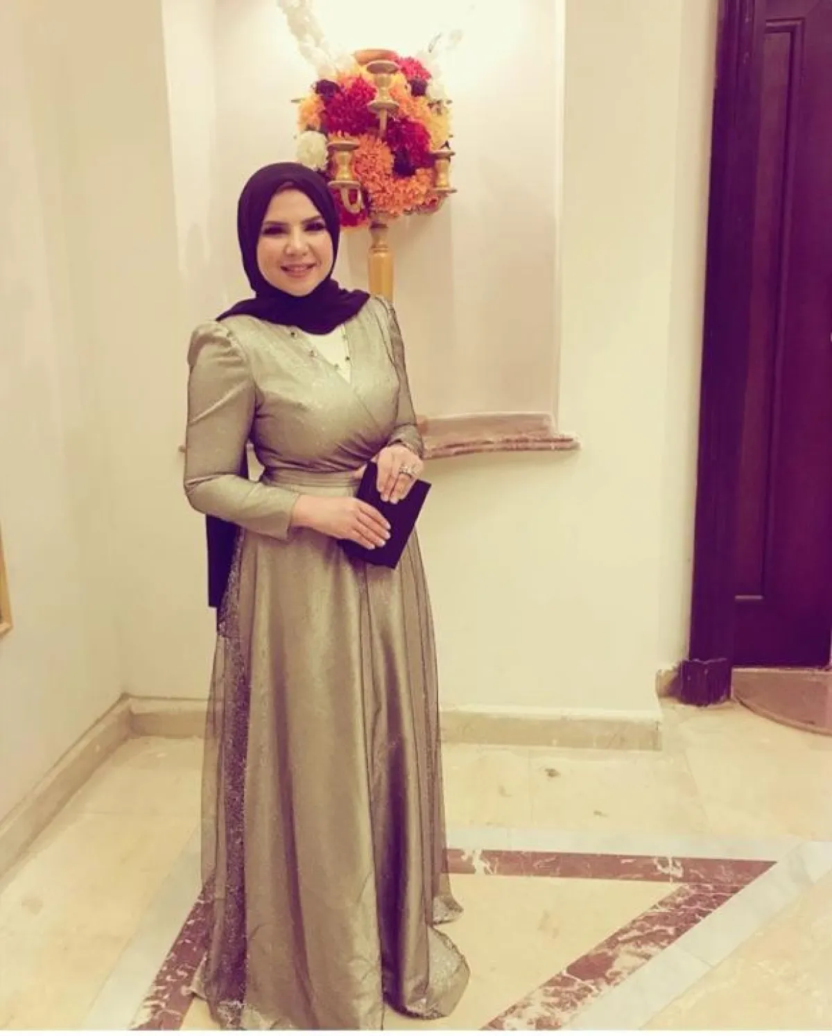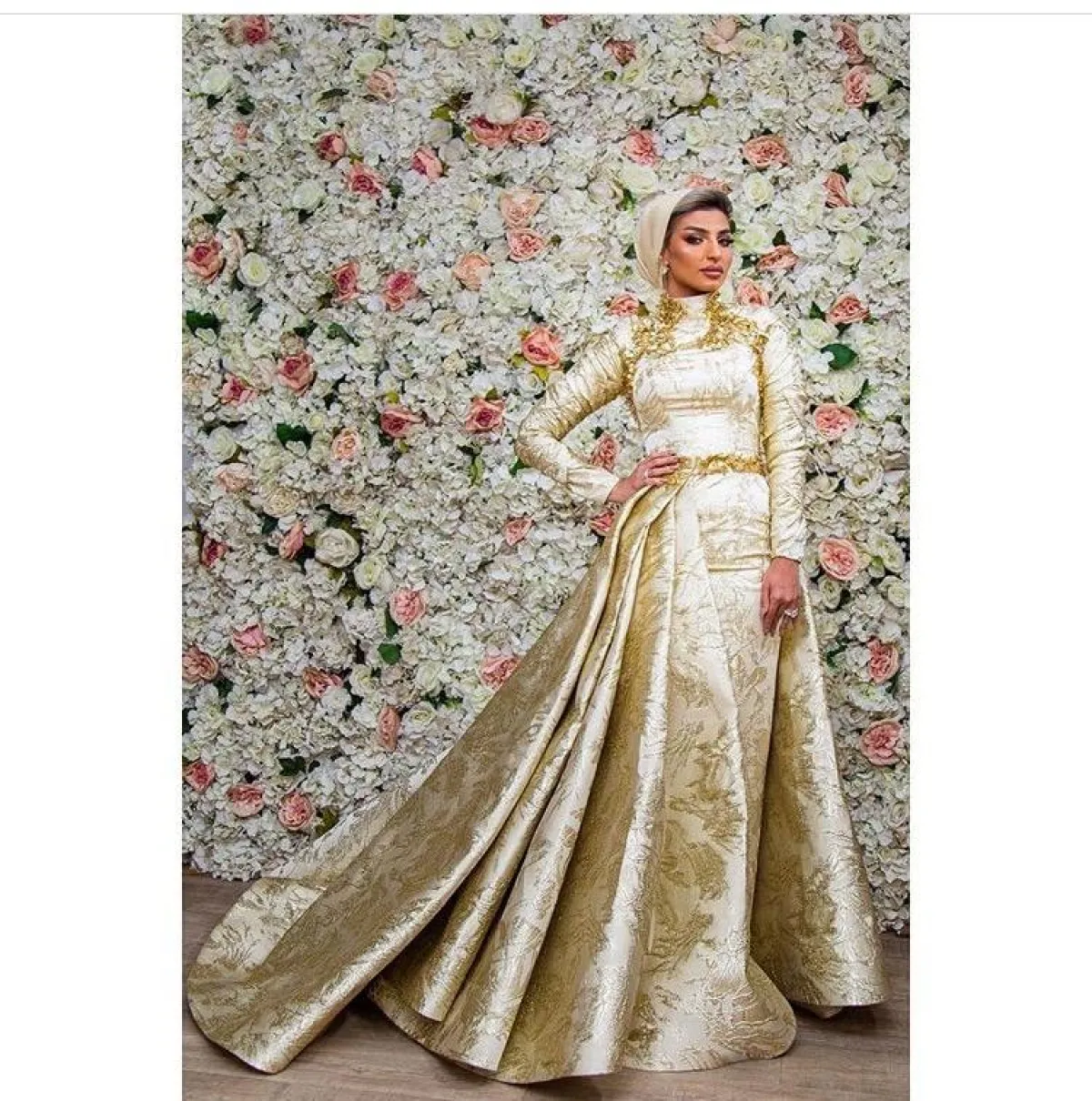 من الموديلات التي تناسب المحجبات بشكل كبير هي تصاميم الـ Open Front، تجعلها تبدو أنيقة ومميزة، وتناسب الحجاب كذلك، مثل هذا الفستان المخملي من الساتان اللامع من سلمى متولي، بدرجات البيج الذهبية، والتطريزات البارزة لاطلالة غاية في الفخامة.