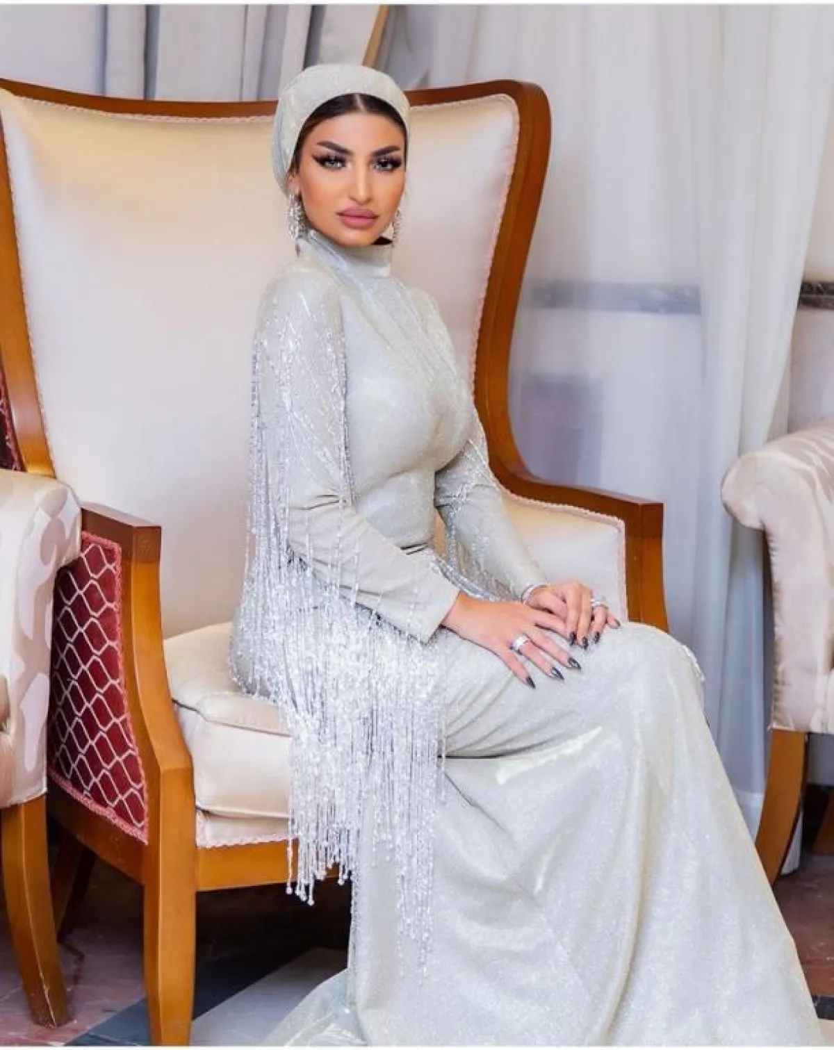 أعجبنا هذا الفستان الميدي مع الشراشيب على الأكتاف والأكمام، ولونه الأبيض الثلجي اللامع من المدونة وخبيرة التجميل سلمى متولي، نسقت معه توربان من خامة الفستان نفسها لاطلالة حيادية.