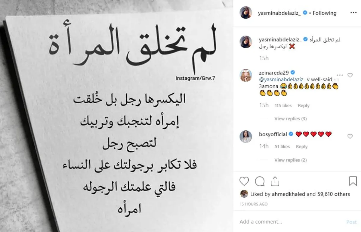 ونشرت عبد العزيز عبر حسابها الشخصي على موقع إنستقرام صورة لمقولة مأثورة تقول: لم تخلق المرأة ليكسرها رجل، بل خلقت امرأة لتنجبك وتربيك لتصبح رجل، فلا تكابر برجولتك على النساء فالتي علمتك الرجولة امرأة!!