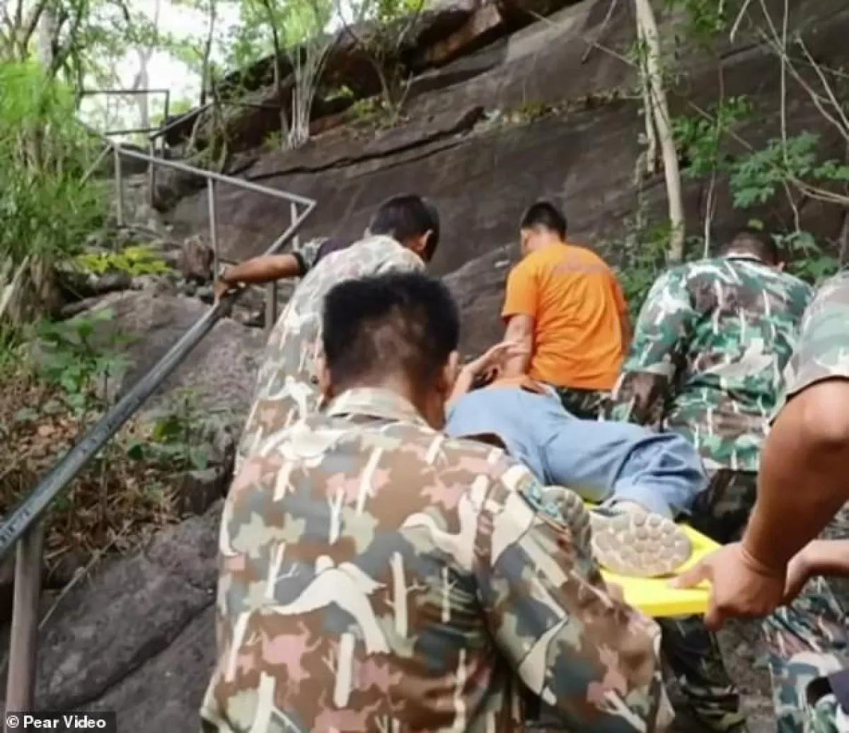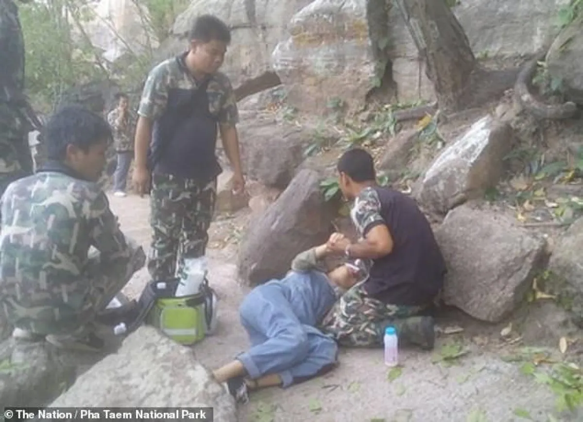 اكتشفت السقوط سائحة؛ حيث وجدتها مستلقية بجروح في الحديقة بعد أن هبطت من الهاوية، وقال الضابط «تشارنشاي» إنها وطفلها الذي لم يولد بعد، نجوا بأعجوبة بعد سقوطها.