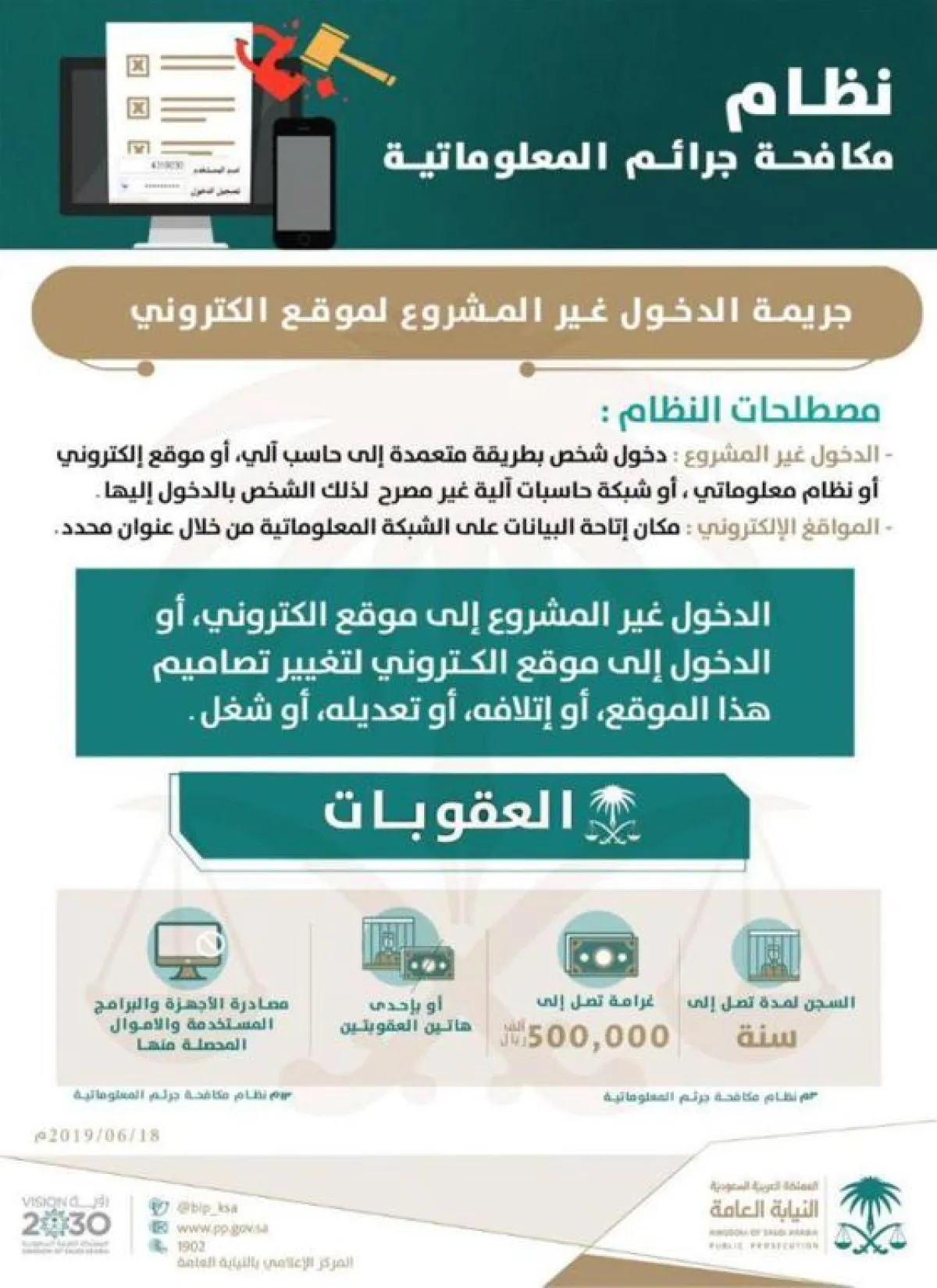 وقالت النيابة العامة، في تغريدة: «أخي المواطن.. أخي المقيم.. جريمة الدخول غير المشروع لموقع إلكتروني تُقترف بدخول شخص غير مصرح له بالدخول بطريقة متعمدة لمكان إتاحة البيانات عبر الشبكة المعلوماتية من خلال العنوان المحدد، أو دخول ذلك الموقع للعبث به أو شغل عنوانه المجرم طبقاً لنظام مكافحة الجرائم المعلوماتية».