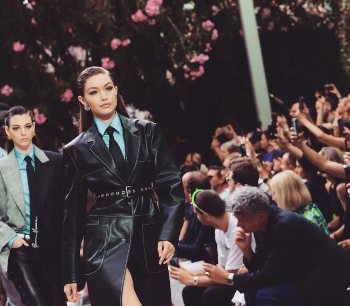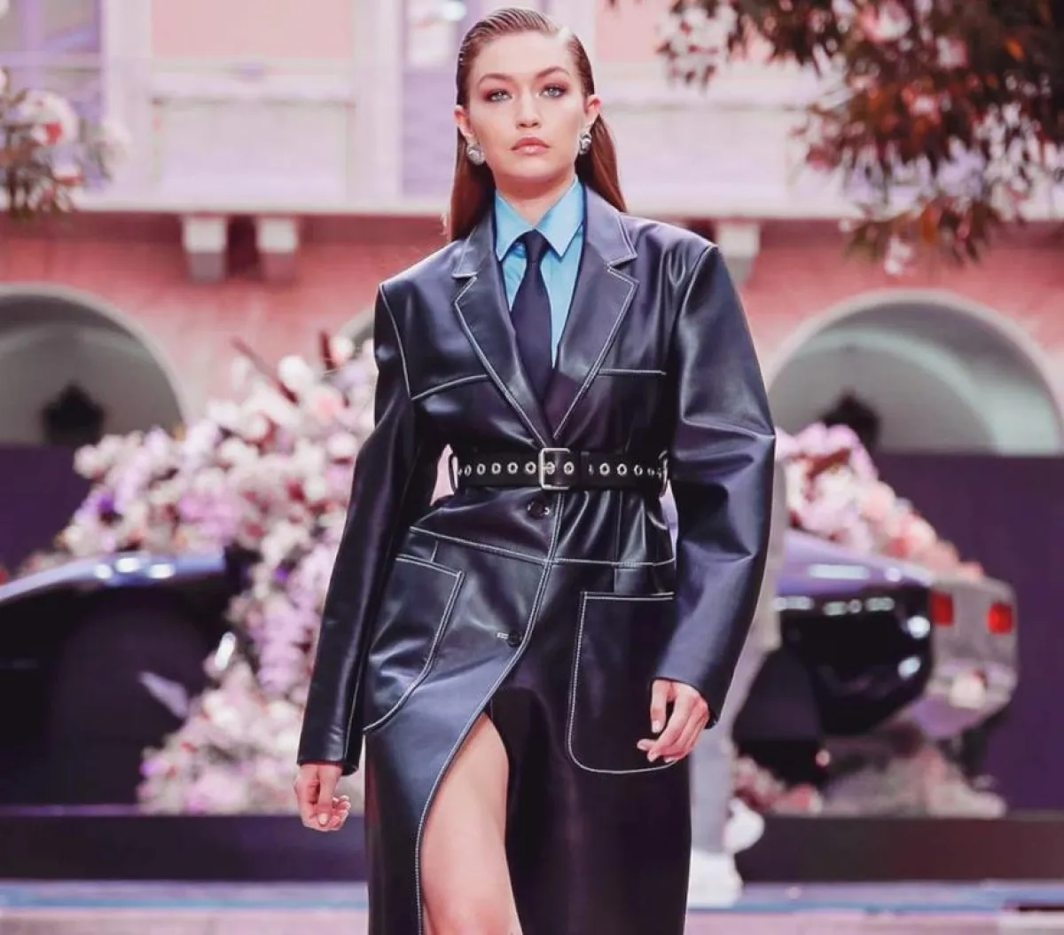 اعتمدت جيجي حديد خلال مرورها مؤخراً على منصة عرض الأزياء الدار العالمية فيرساتشي ، البليزر الفستان من قماش الجلد ، مع قميص وربطة عنق رجالية . أضافت حزام الخصر لأزيائها لاطلالة انثوية .