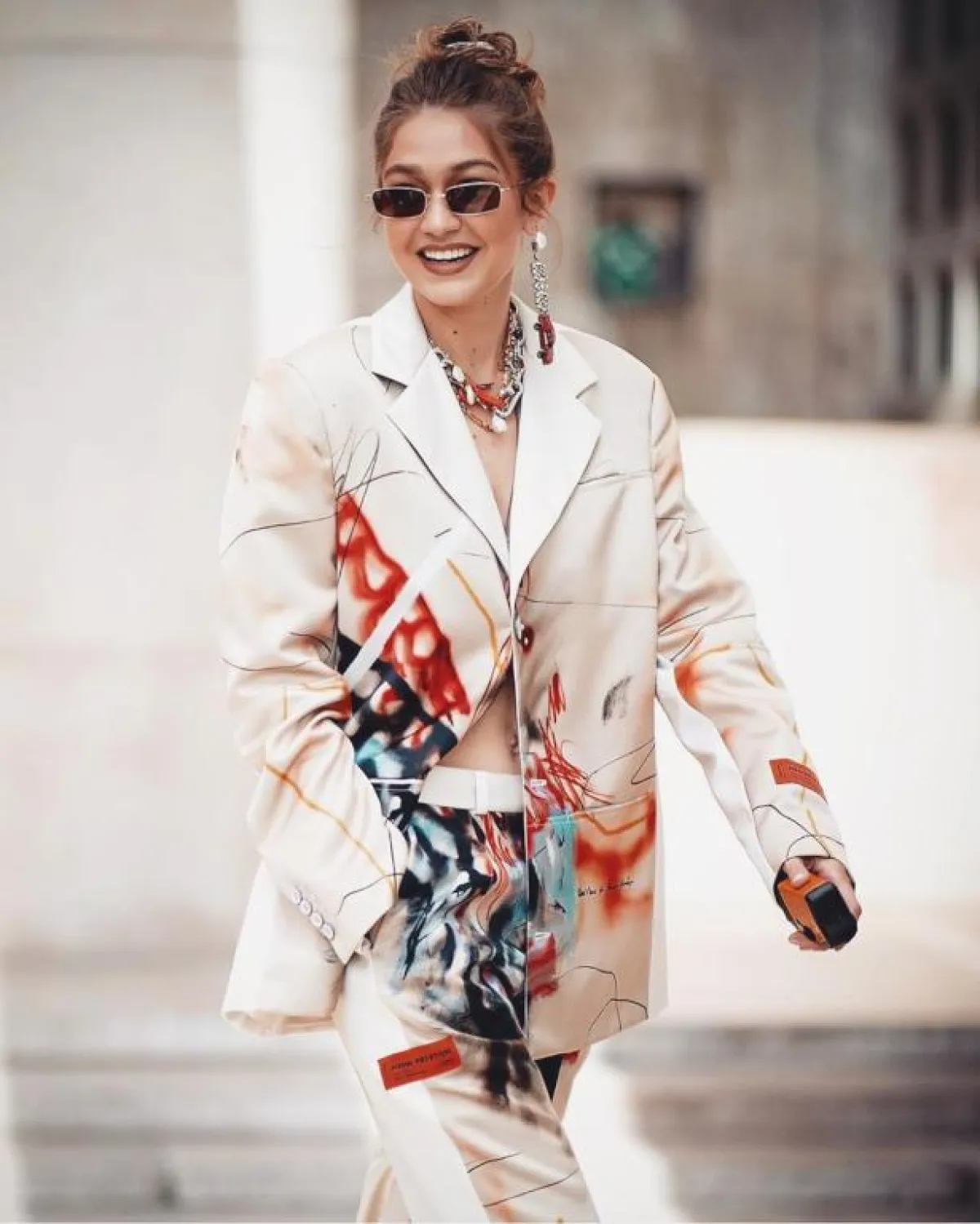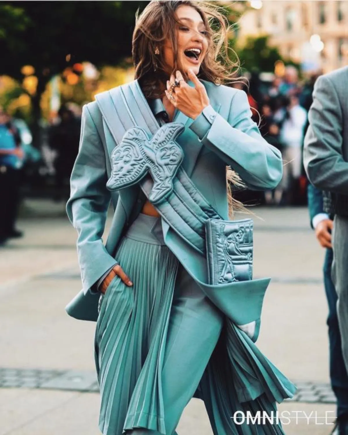 باطلالة نهارية أخرى ، اختارت جيجي صيحة البدلة الفضفاضة من اللون الأزرق، وهي من توقيع لويس فويتون .